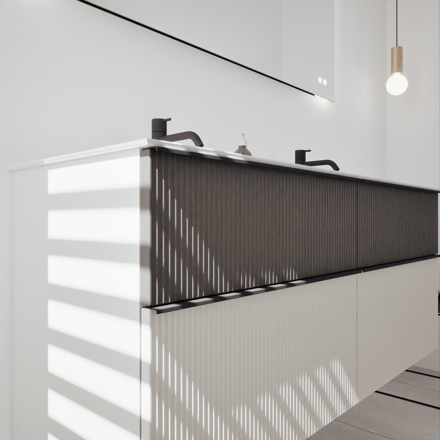 - 2 Schubladen oben, 35 cm tief, mit vertikaler Struktur inkl. mit Siphonausschnitt und Inneneinteilung
