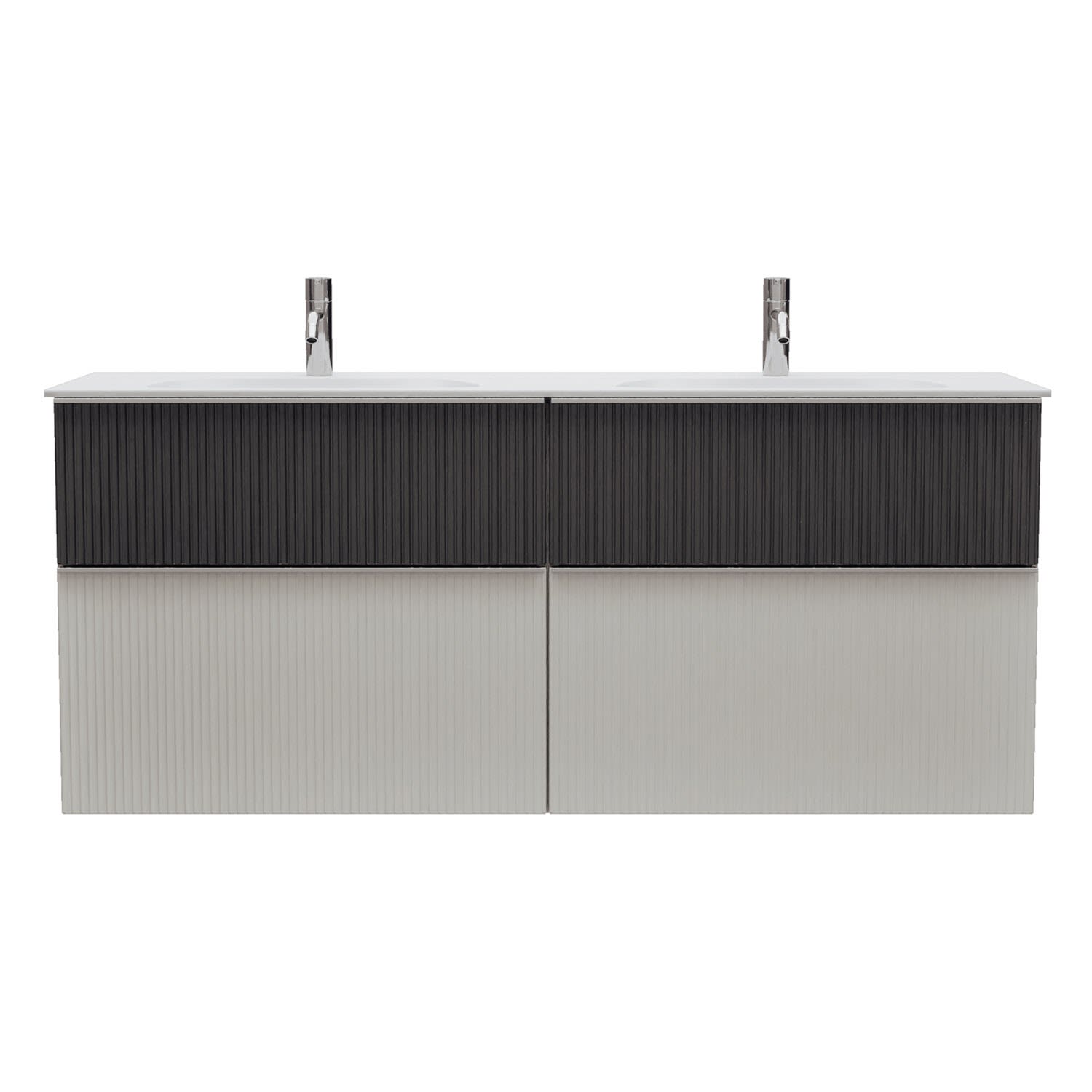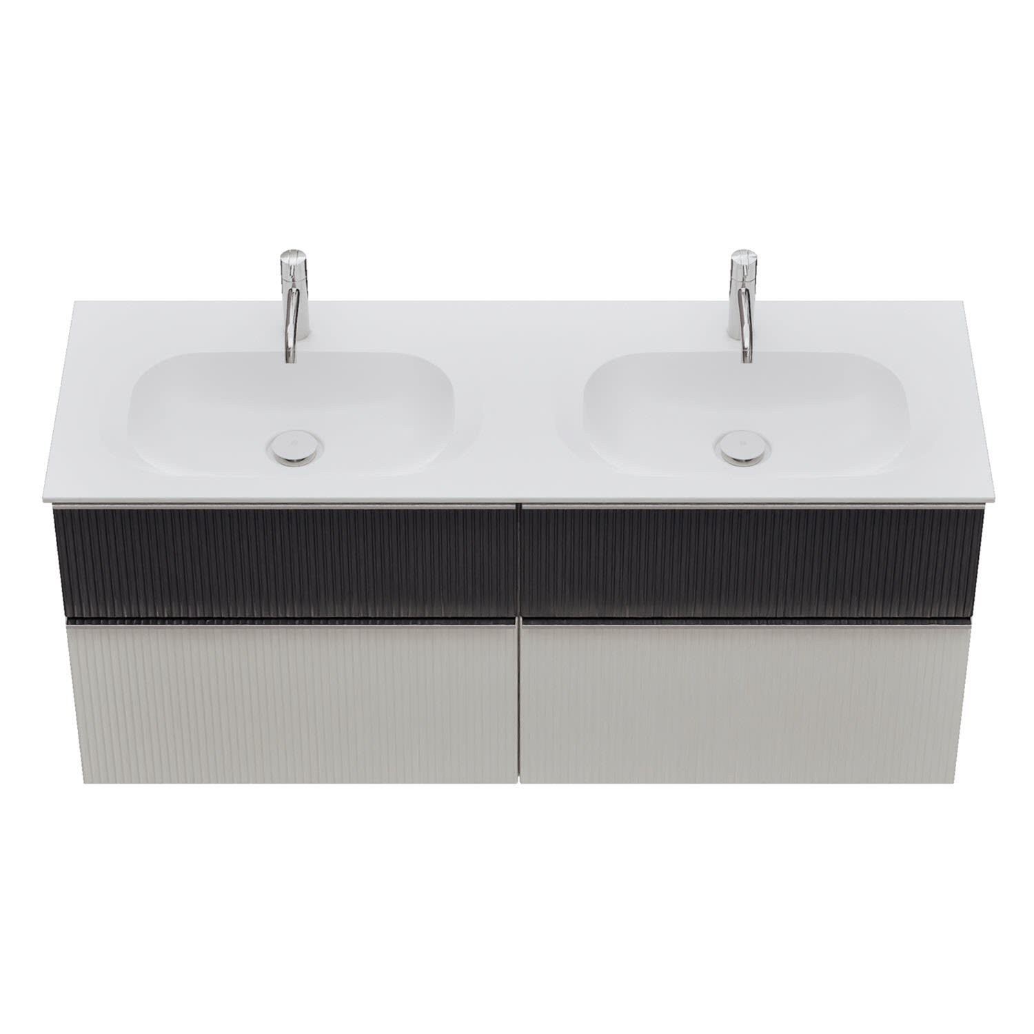 - 2 Schubladen oben, 35 cm tief, mit vertikaler Struktur inkl. mit Siphonausschnitt und Inneneinteilung