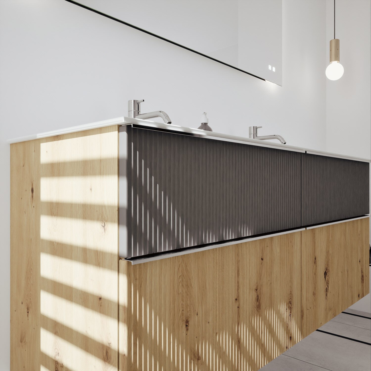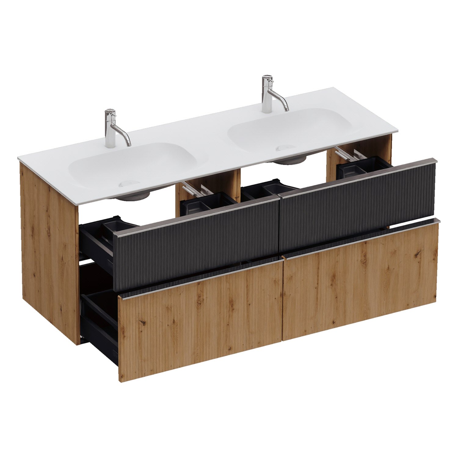 - 2 Schubladen oben, 35 cm tief, mit vertikaler Struktur inkl. mit Siphonausschnitt und Inneneinteilung