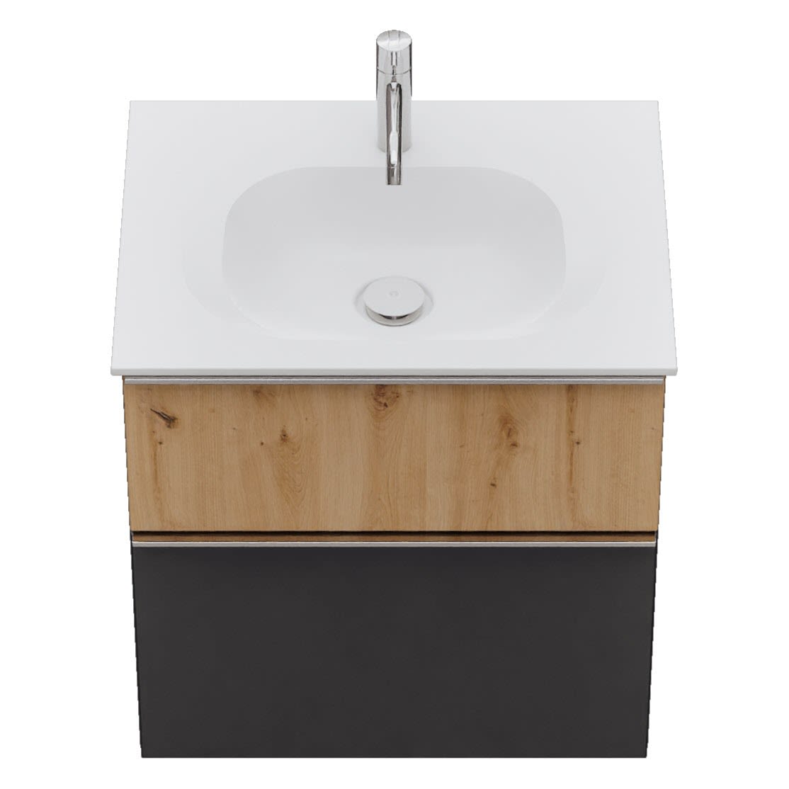 - 1 Schublade oben: 35 cm tief, mit Siphonausschnitt und Inneneinteilung