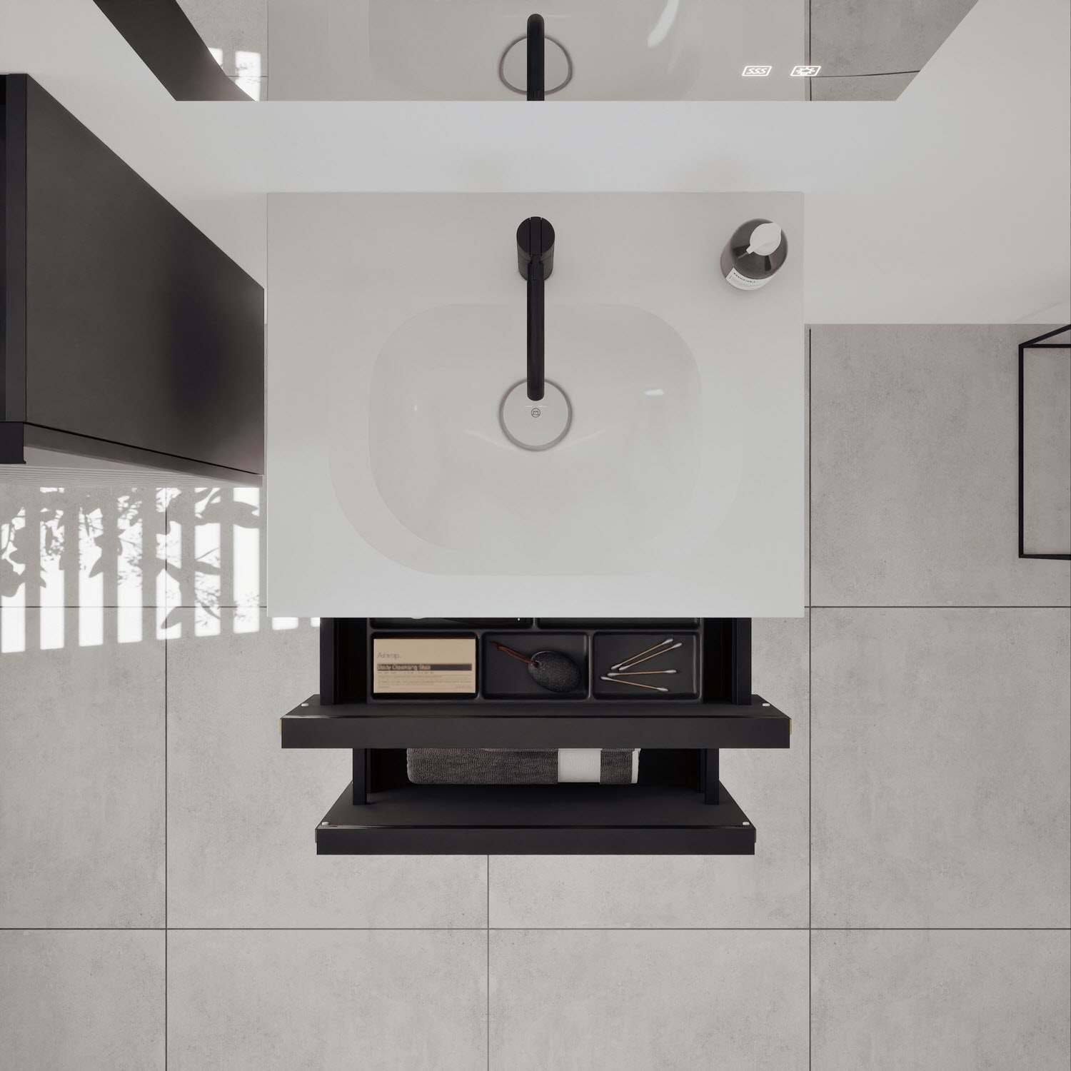 - 1 Schublade oben: 35 cm tief, mit Siphonausschnitt und Inneneinteilung