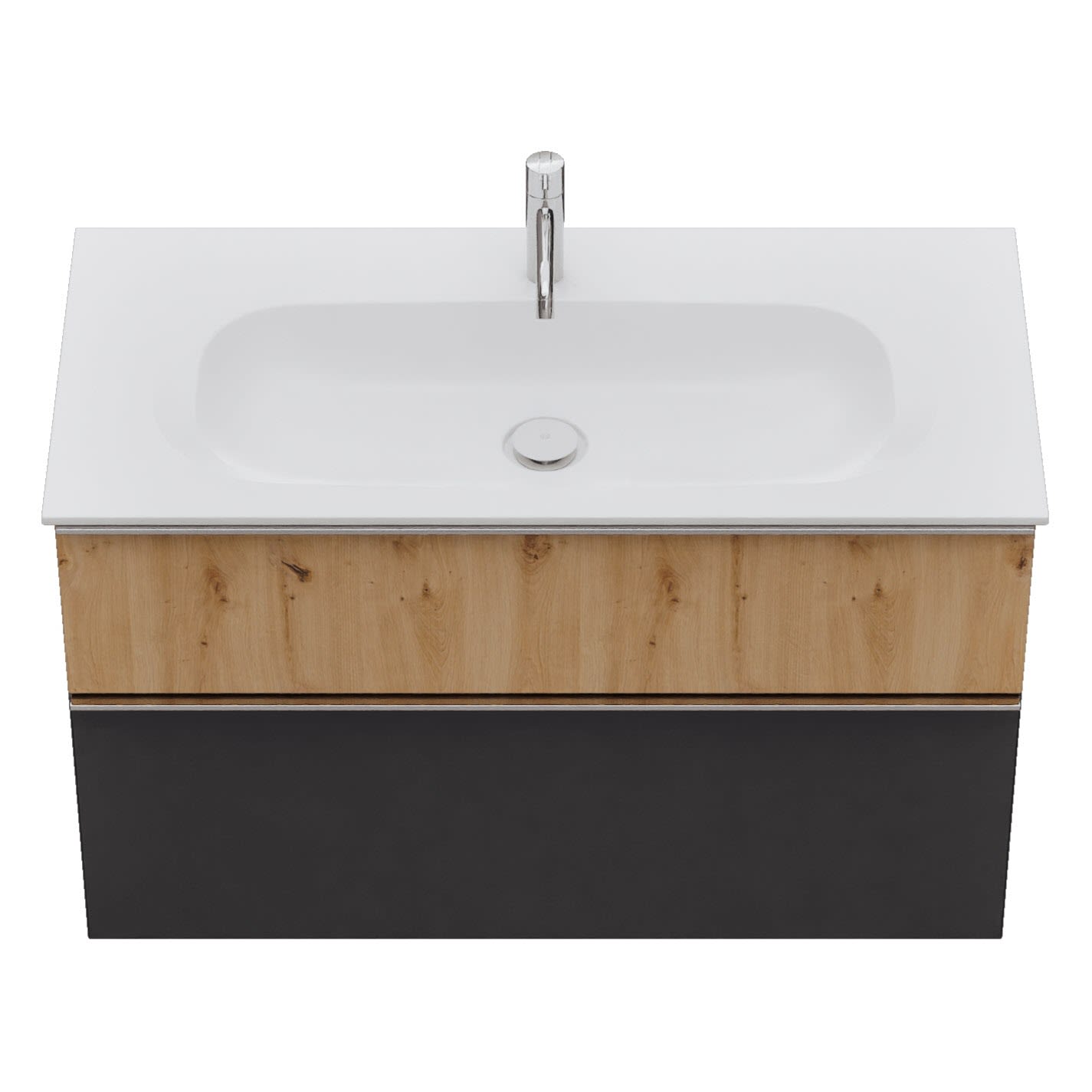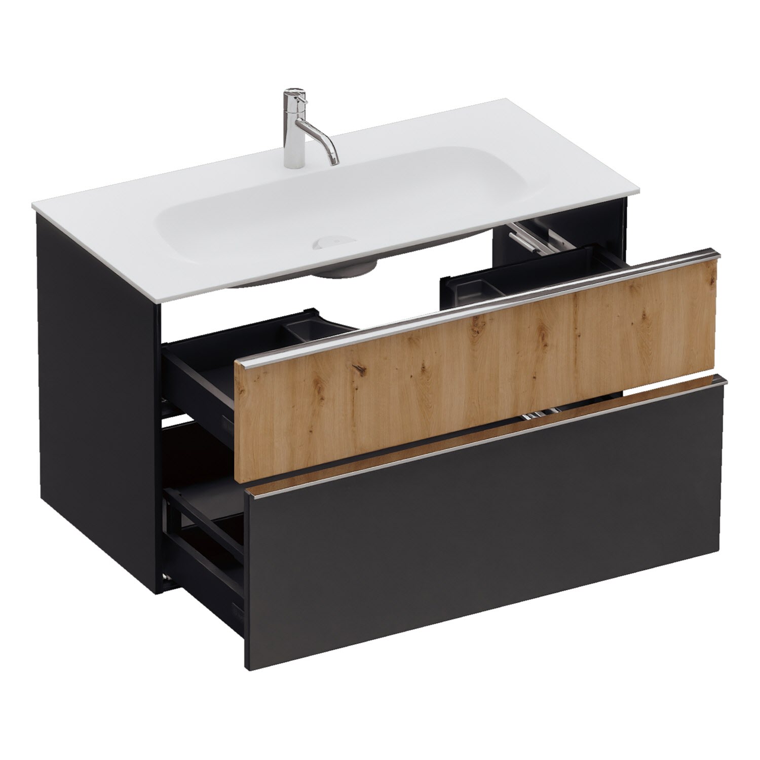 - 1 Schublade oben, 35 cm tief, mit Siphonausschnitt und Inneneinteilung
