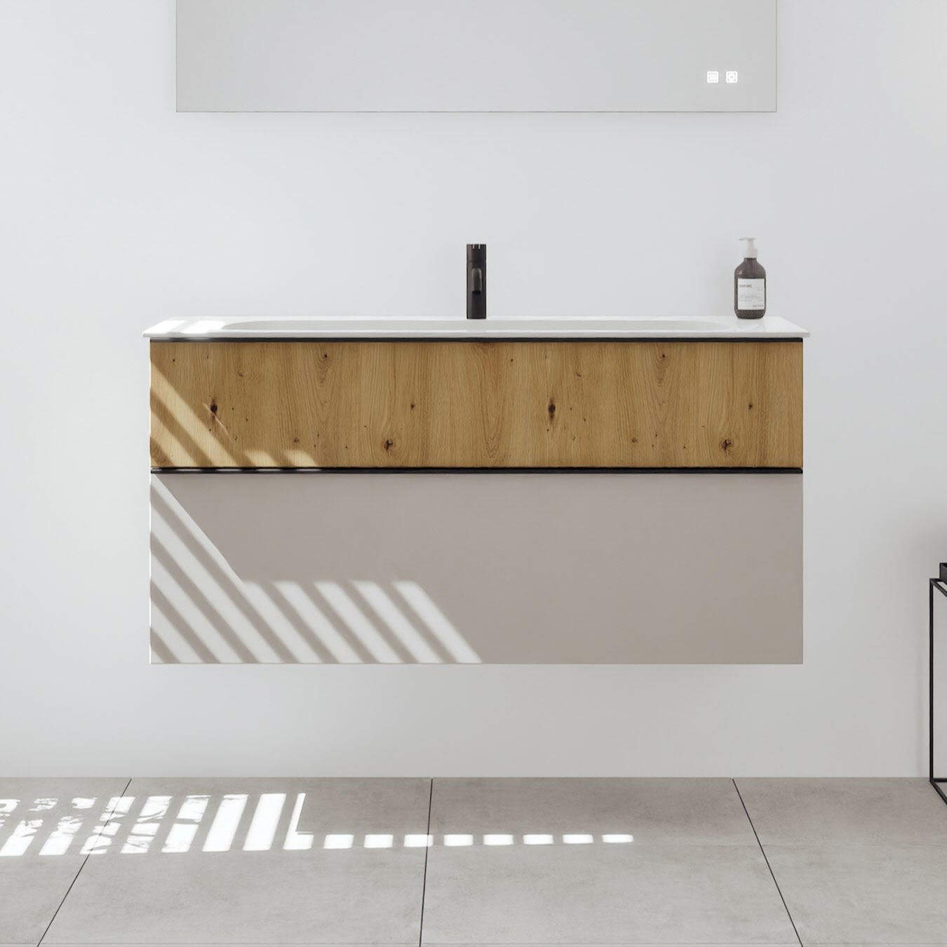 - 1 Schublade oben, 35 cm tief, mit Siphonausschnitt und Inneneinteilung