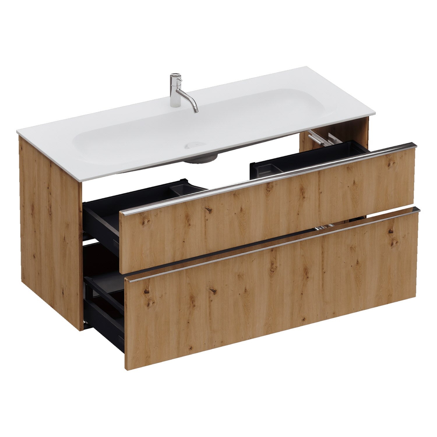 - 1 Schublade oben, 35 cm tief, mit Siphonausschnitt und Inneneinteilung