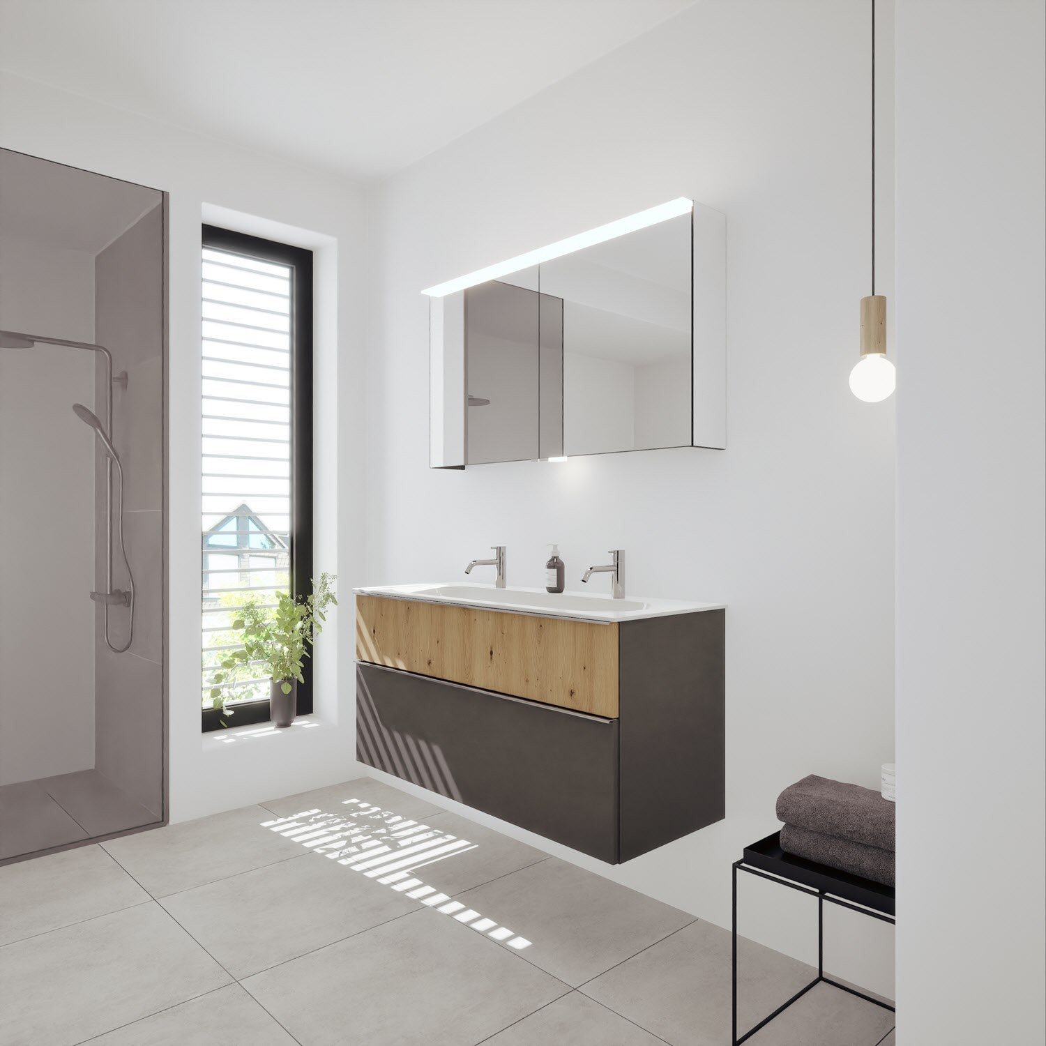 burgbad Fiumo 2.0 Spiegelschrank 120,6 cm mit LED-Aufsatzleuchte und Waschplatzbeleuchtung, 2 Spiegeltüren