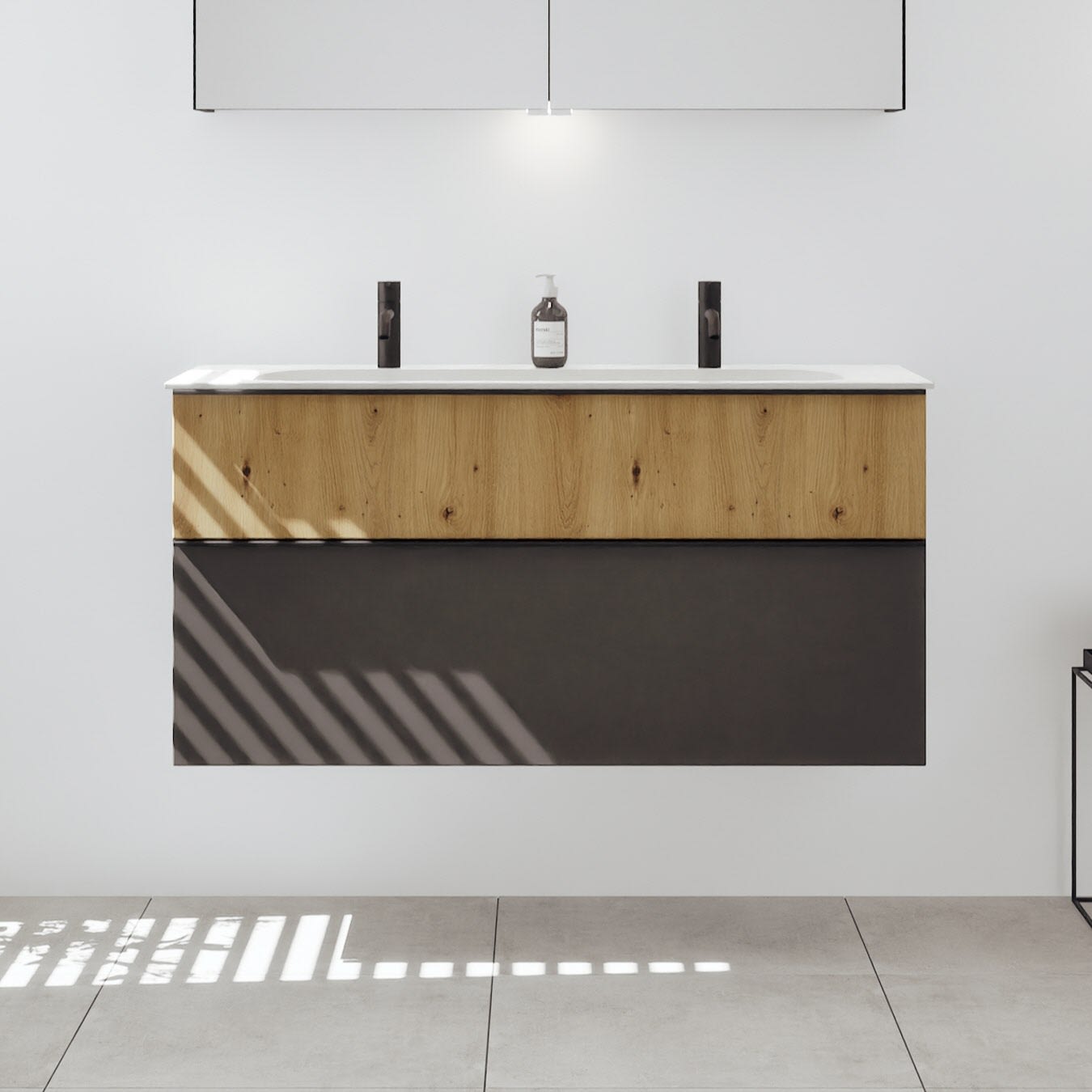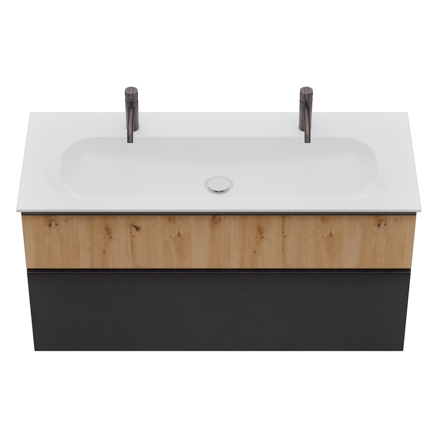 - 1 Schublade oben, 35 cm tief, mit Siphonausschnitt und Inneneinteilung