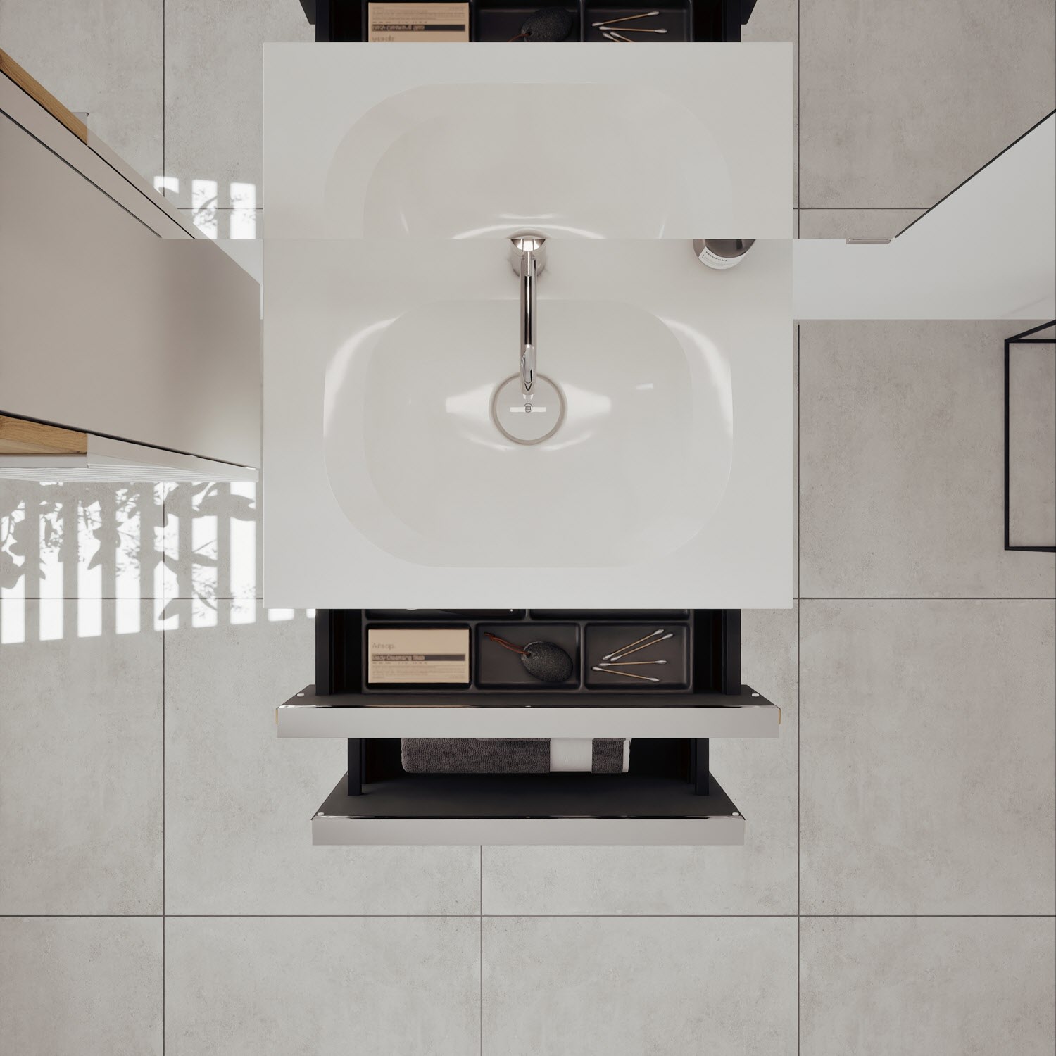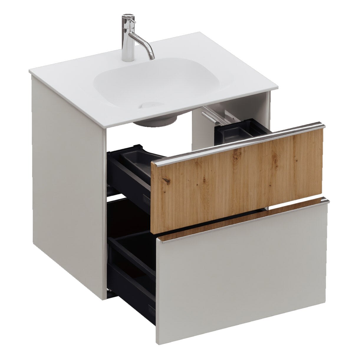 - 1 Schublade oben, 35 cm tief, mit Siphonausschnitt und Inneneinteilung