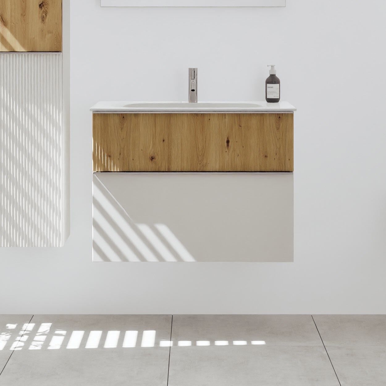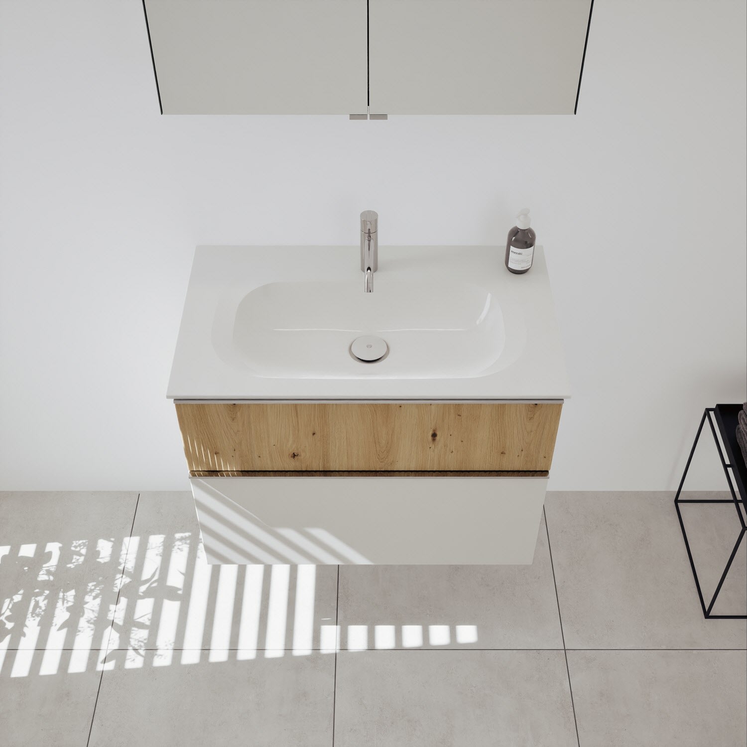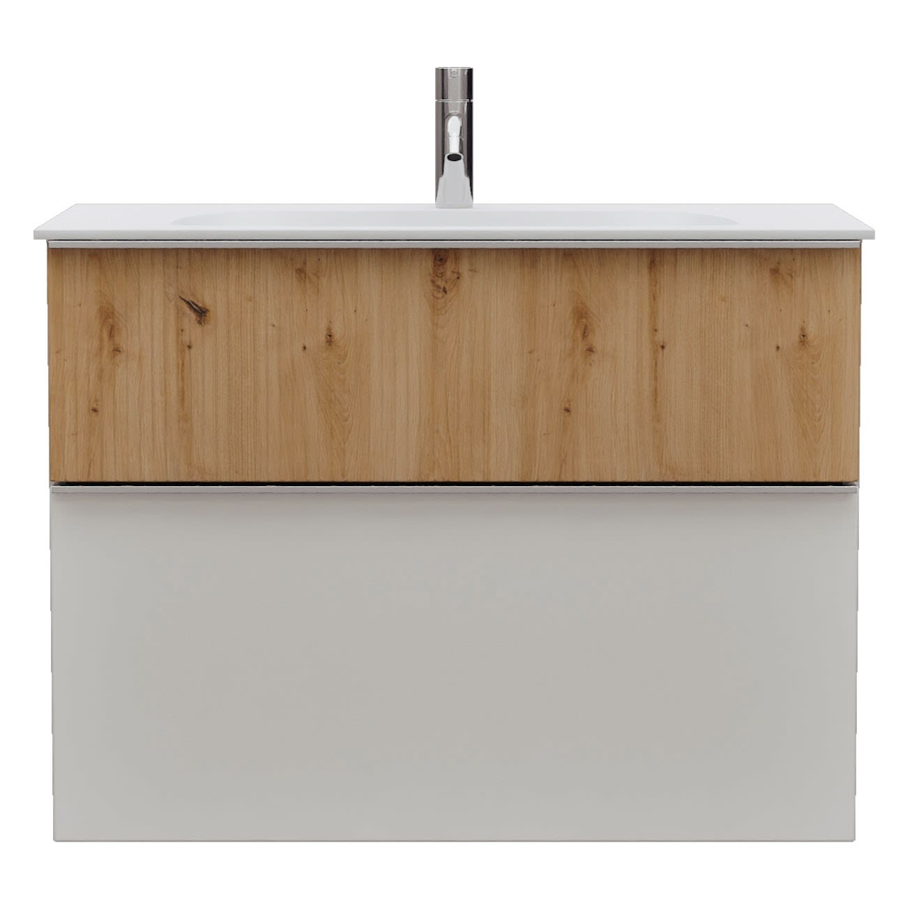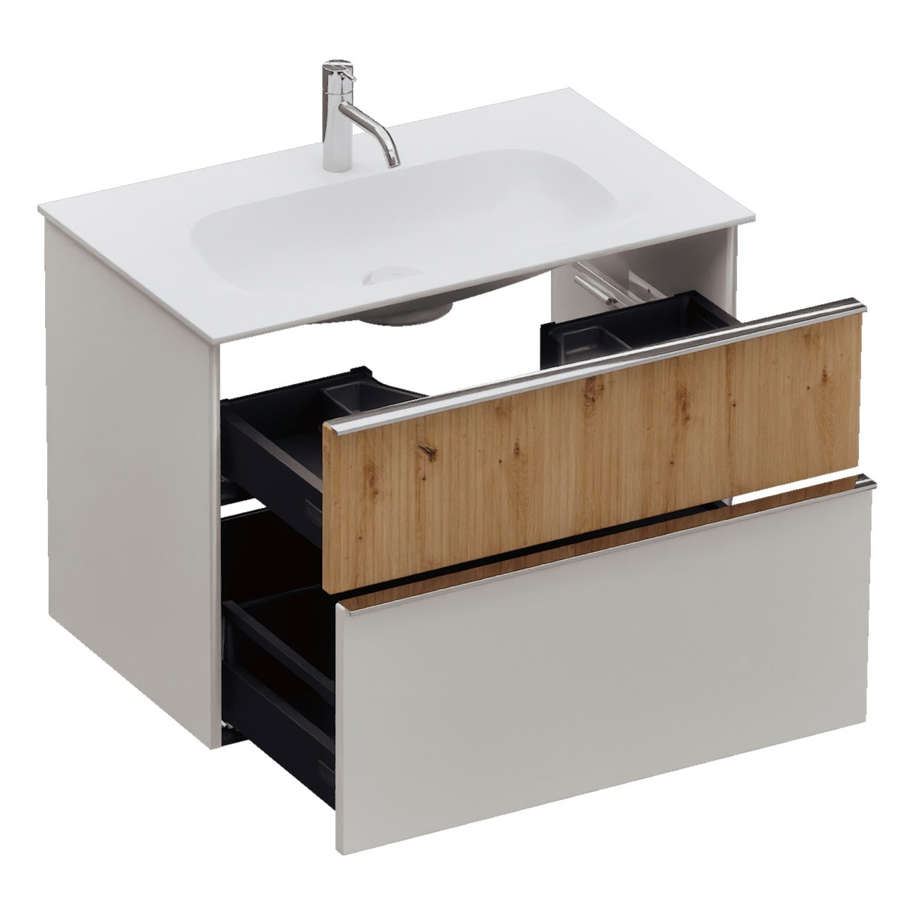 - 1 Schublade oben, 35 cm tief, mit vertikaler Struktur inkl. Siphonausschnitt und Inneneinteilung
