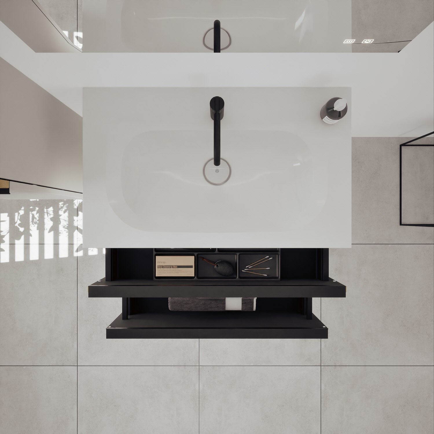 - 1 Schublade oben, 35 cm tief, mit vertikaler Struktur inkl. Siphonausschnitt und Inneneinteilung
