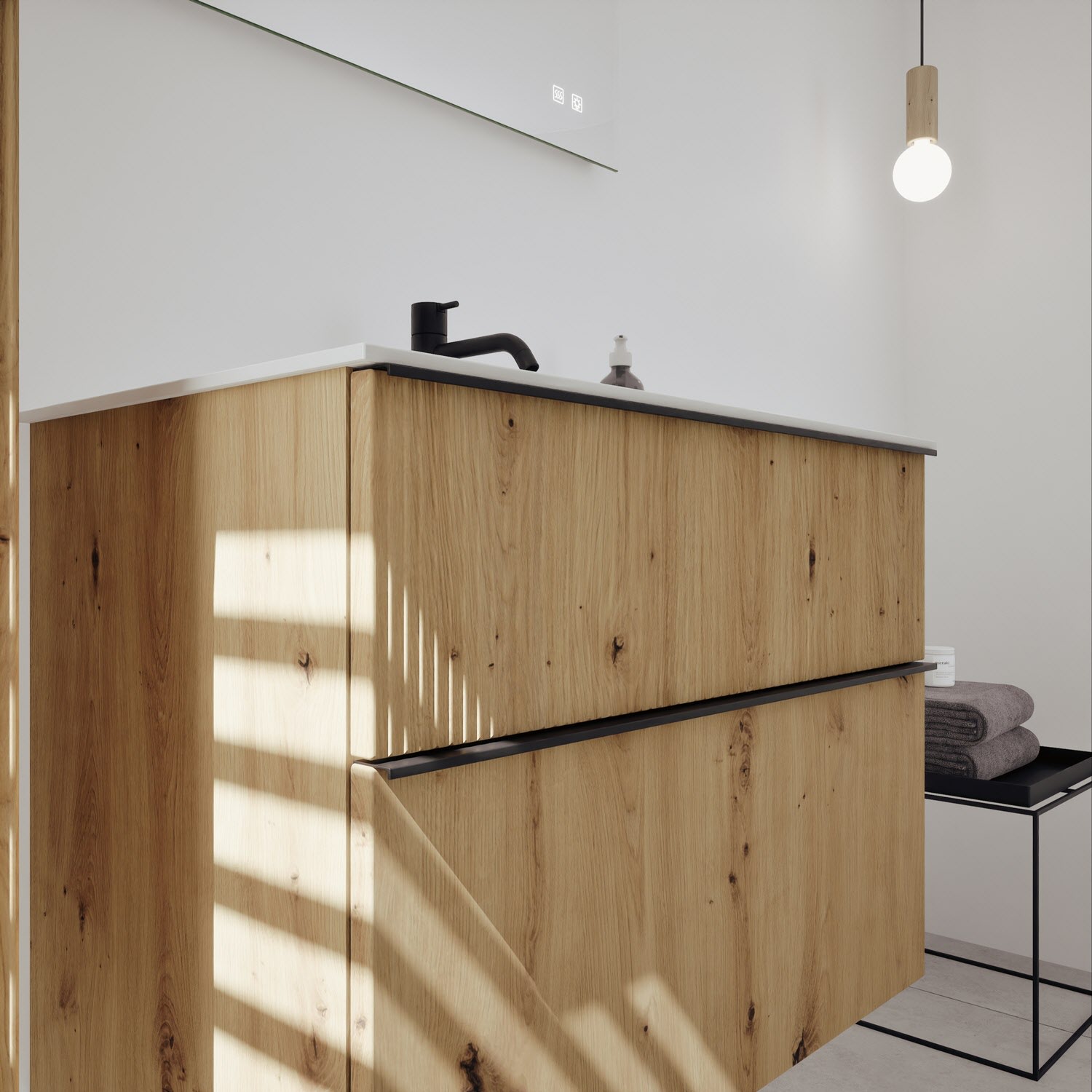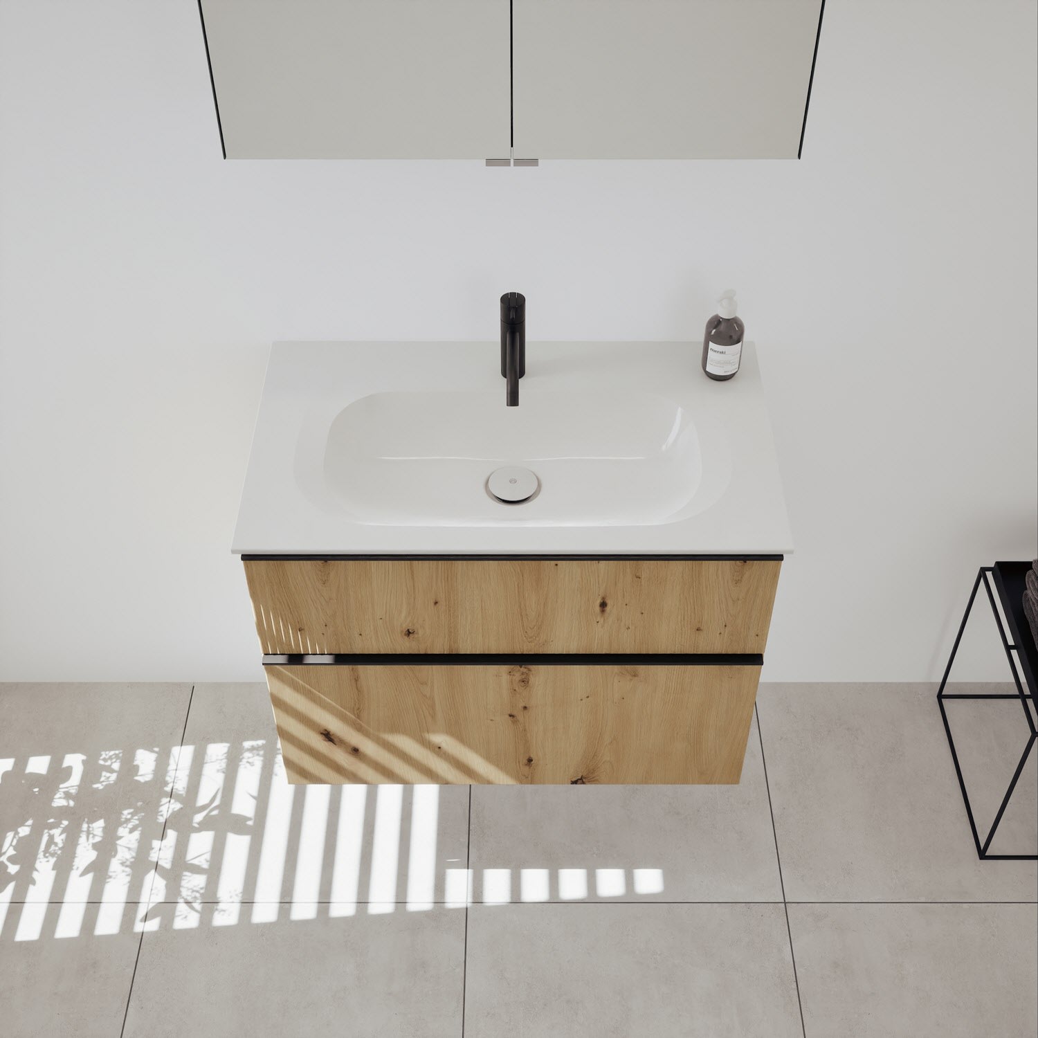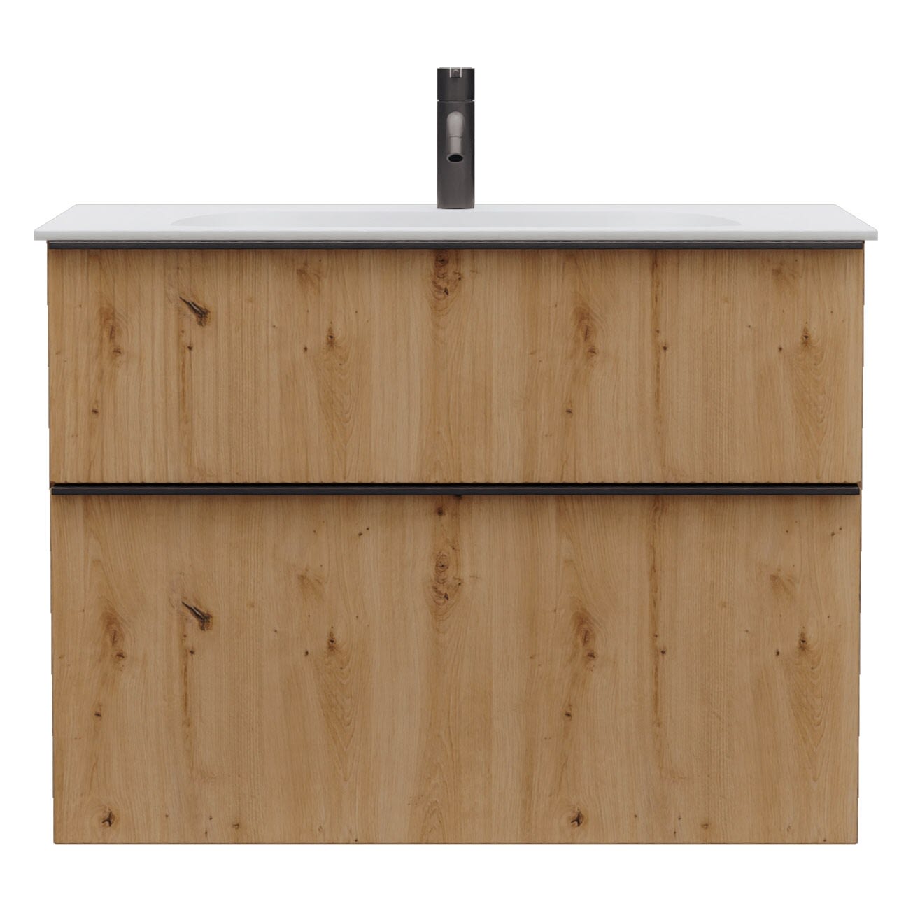 - 1 Schublade oben, 35 cm tief, mit vertikaler Struktur inkl. Siphonausschnitt und Inneneinteilung