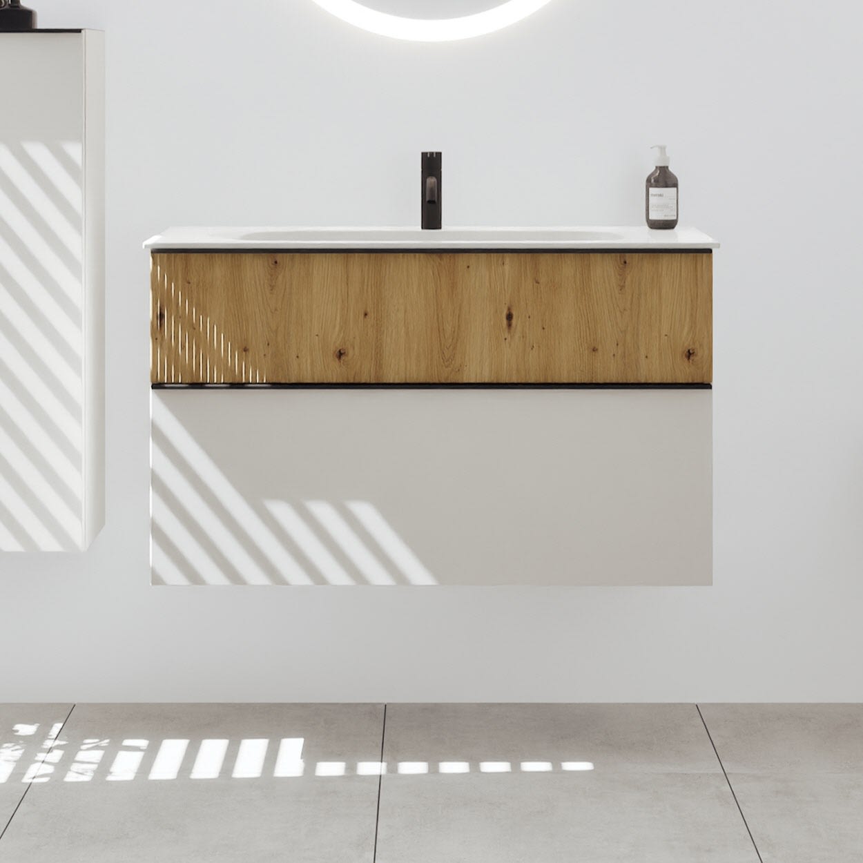 - 1 Schublade oben, 35 cm tief, mit vertikaler Struktur inkl. Siphonausschnitt und Inneneinteilung