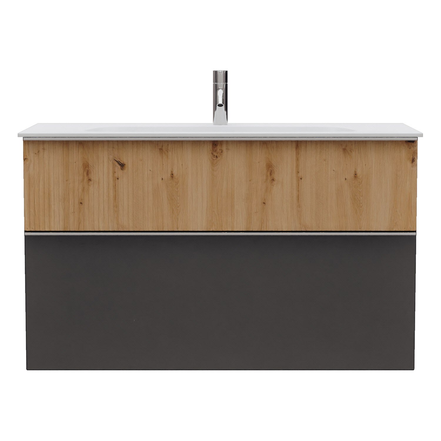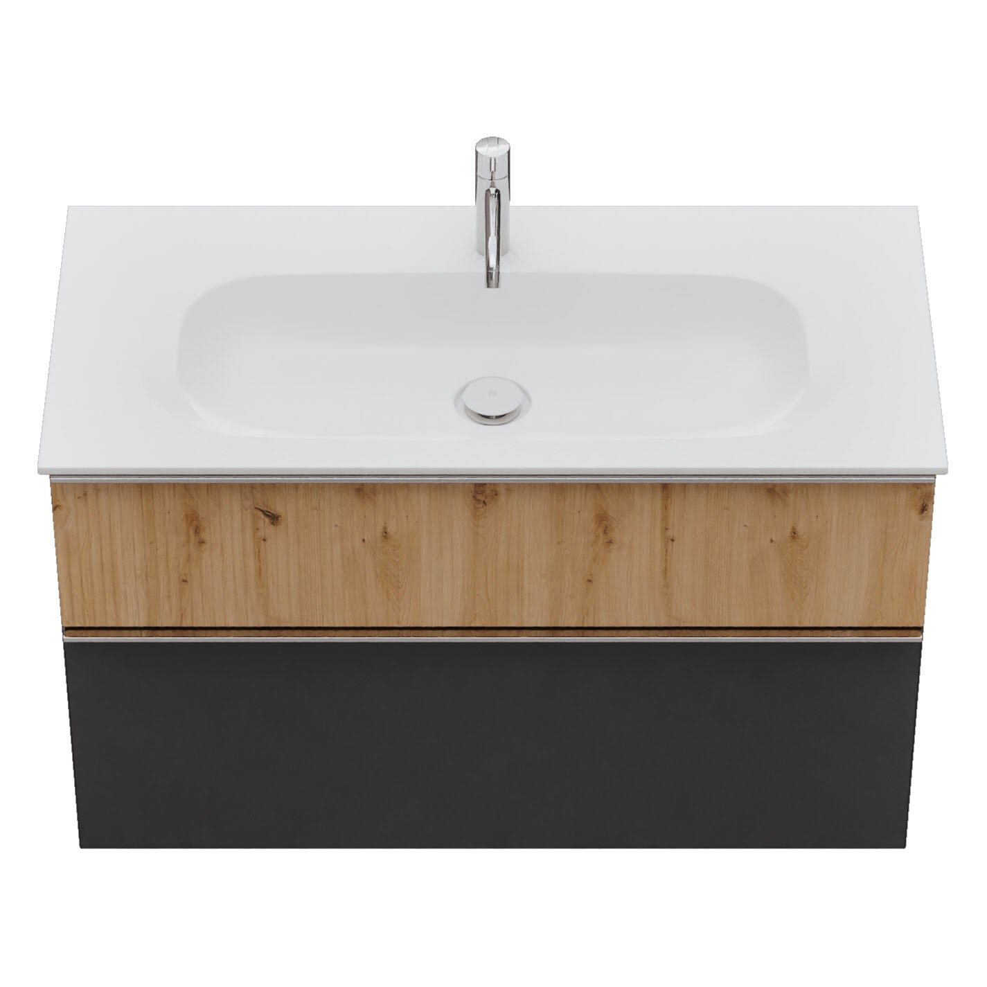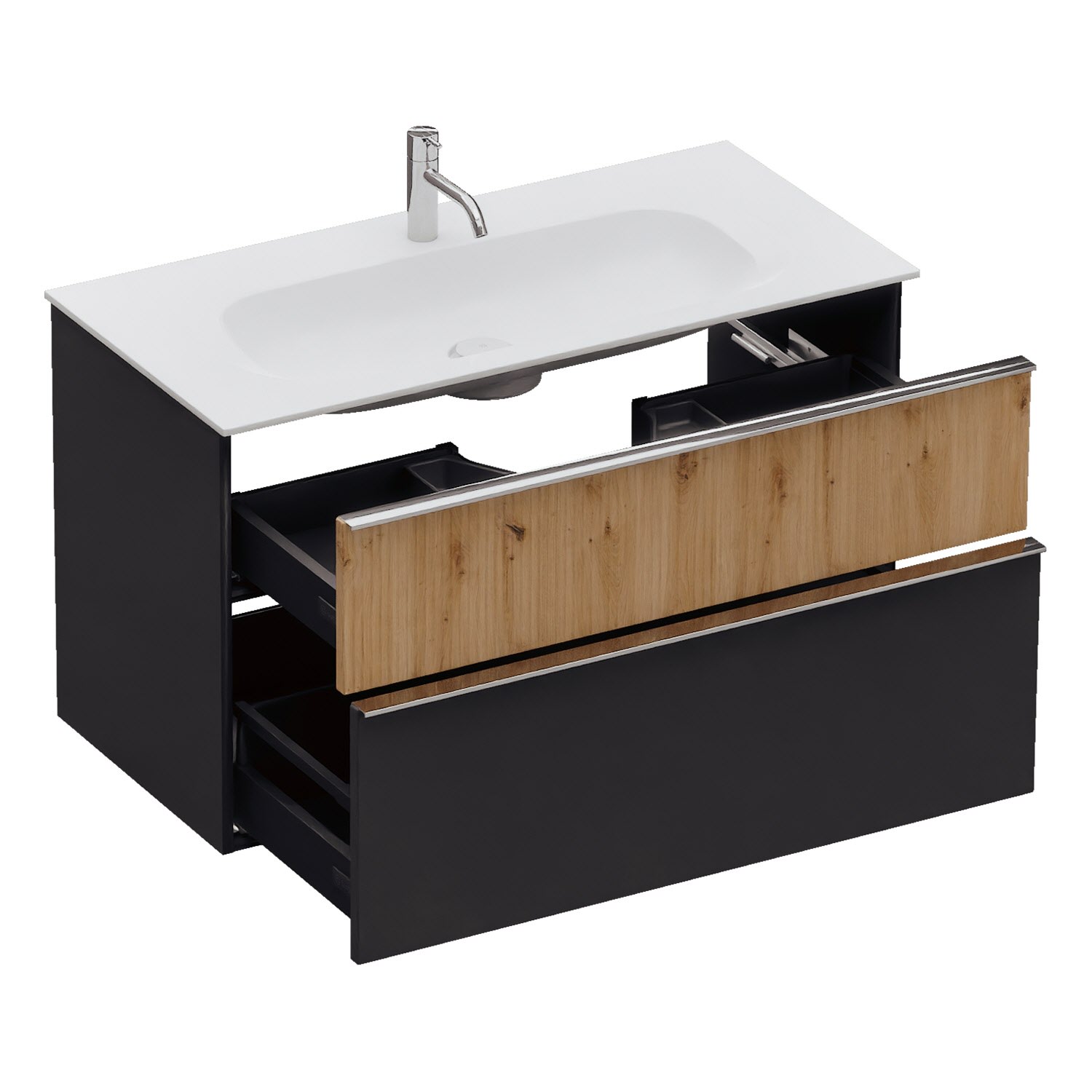 - 1 Schublade oben, 35 cm tief, mit vertikaler Struktur inkl. Siphonausschnitt und Inneneinteilung