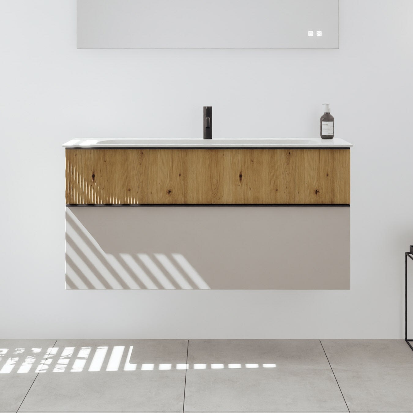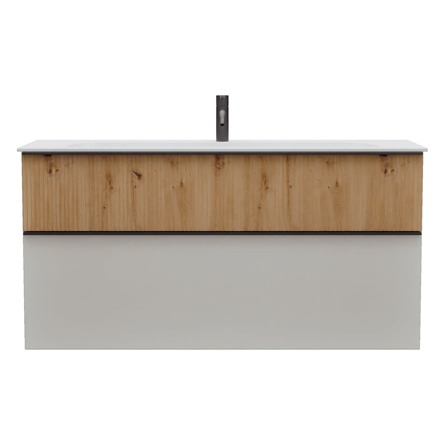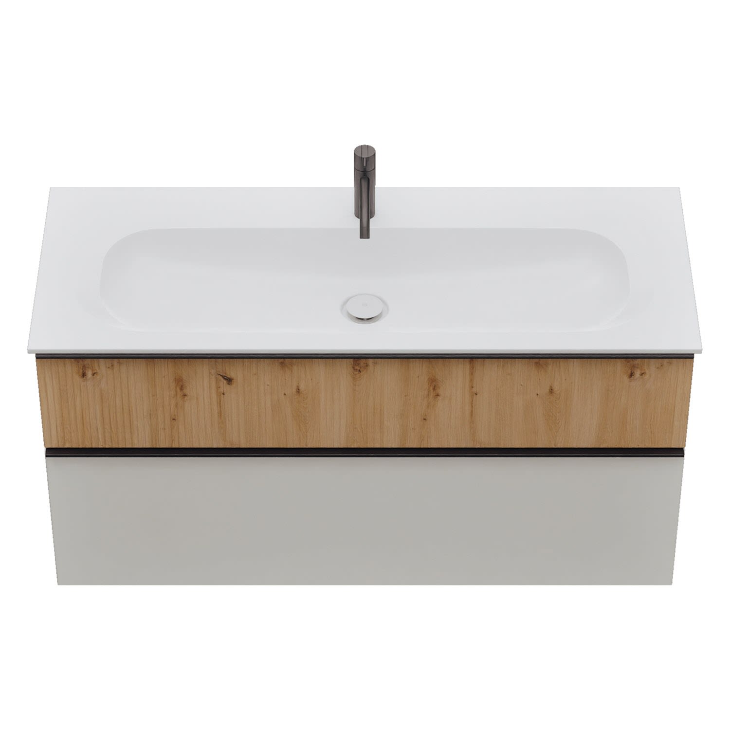 - 1 Schublade oben: 35 cm tief, mit vertikaler Struktur inkl. Siphonausschnitt und Inneneinteilung