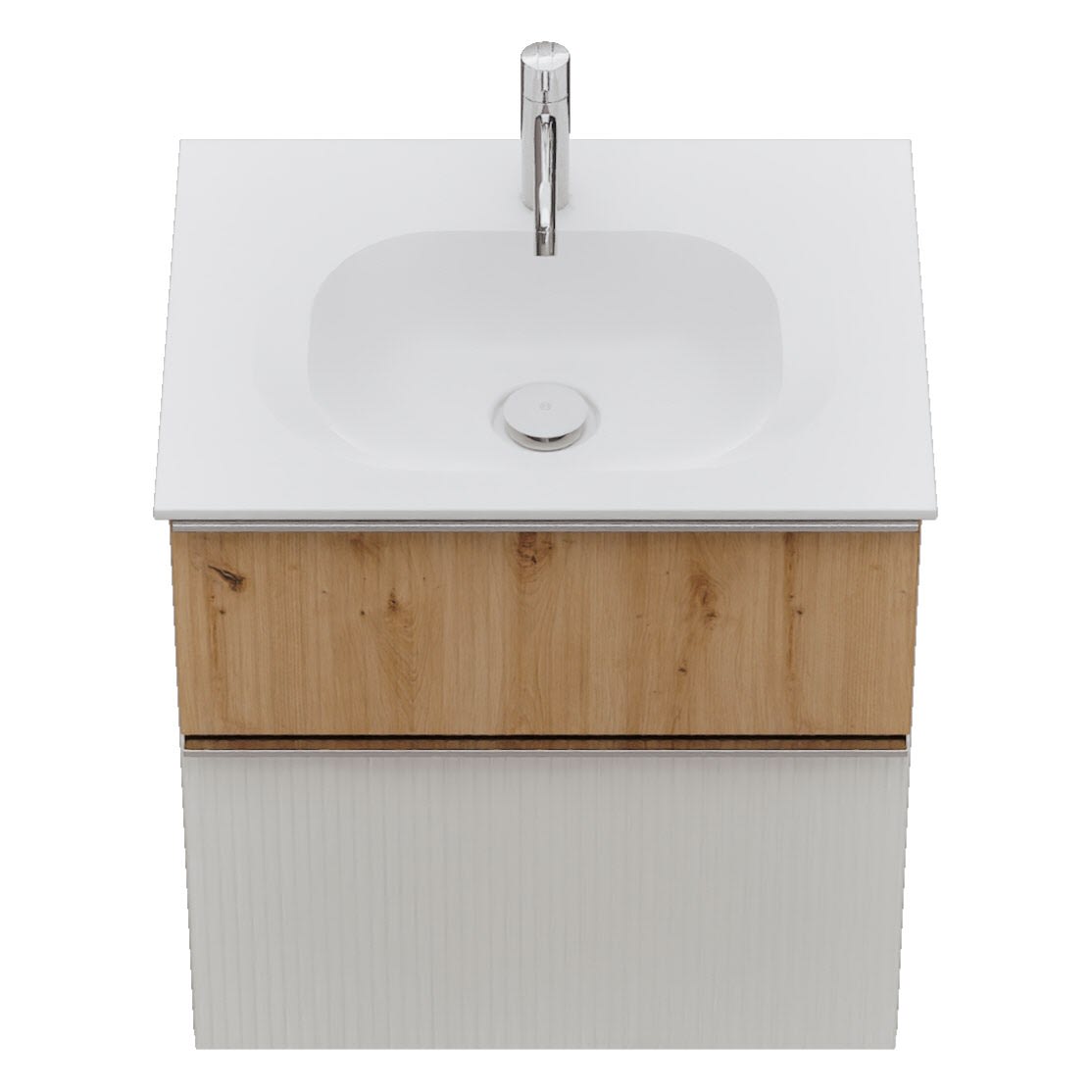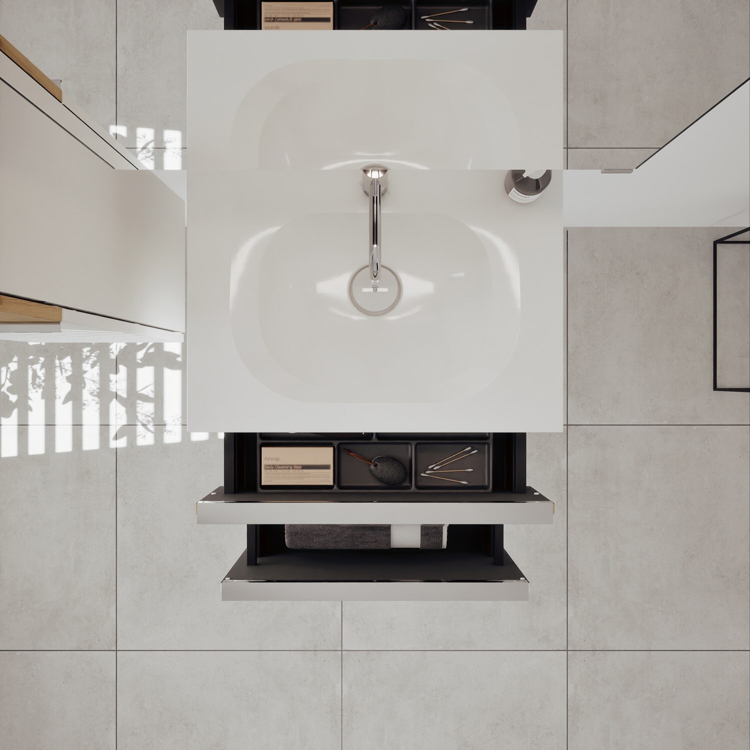 - 1 Schublade oben, 35 cm tief, mit vertikaler Struktur inkl. Siphonausschnitt und Inneneinteilung