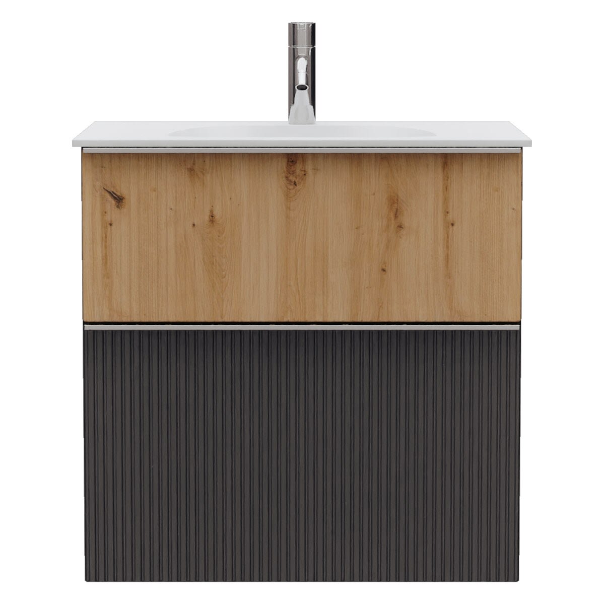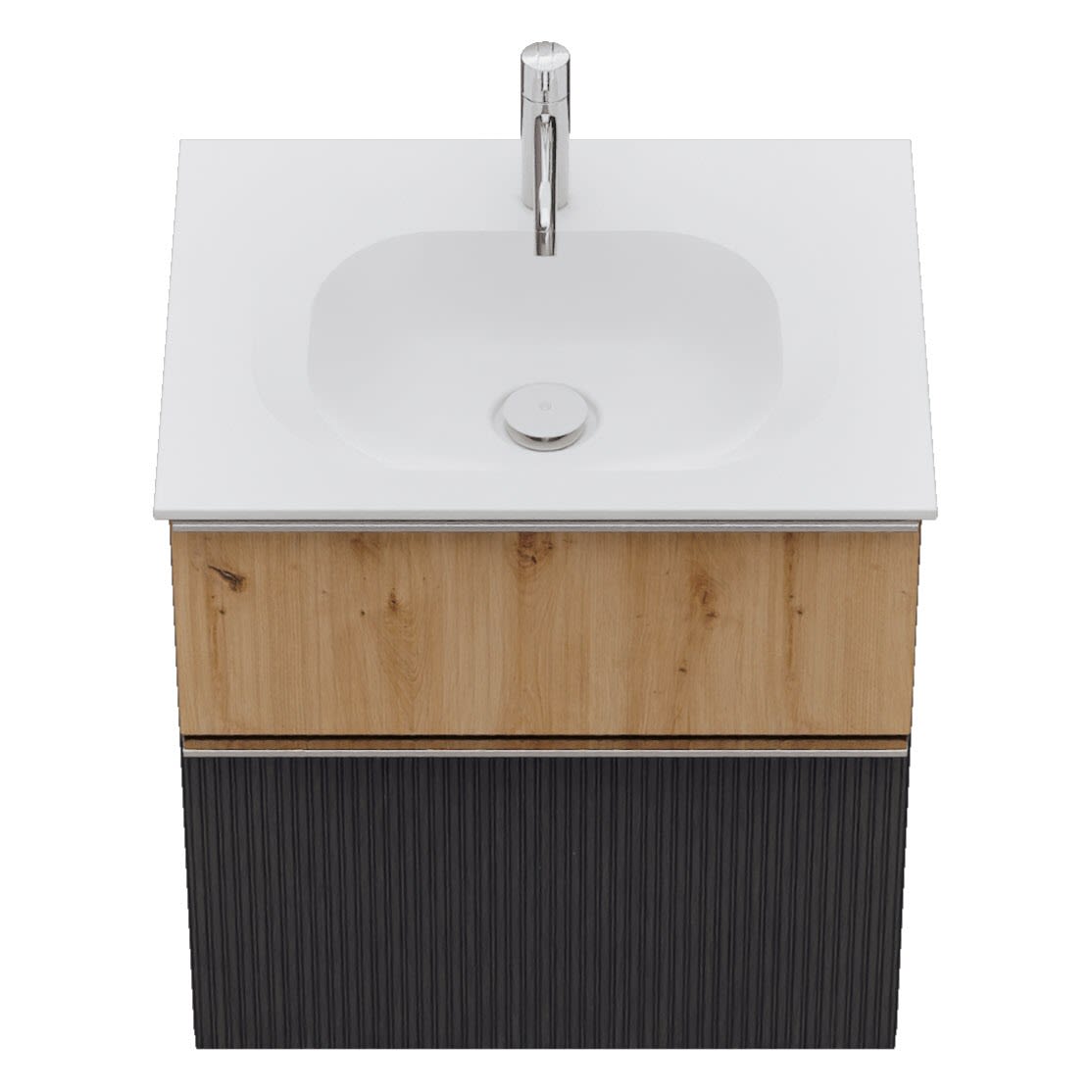 - 1 Schublade oben, 35 cm tief, mit vertikaler Struktur inkl. Siphonausschnitt und Inneneinteilung