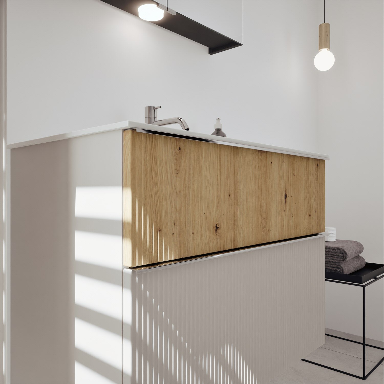 - 1 Schublade oben: 35 cm tief, mit vertikaler Struktur inkl. Siphonausschnitt und Inneneinteilung