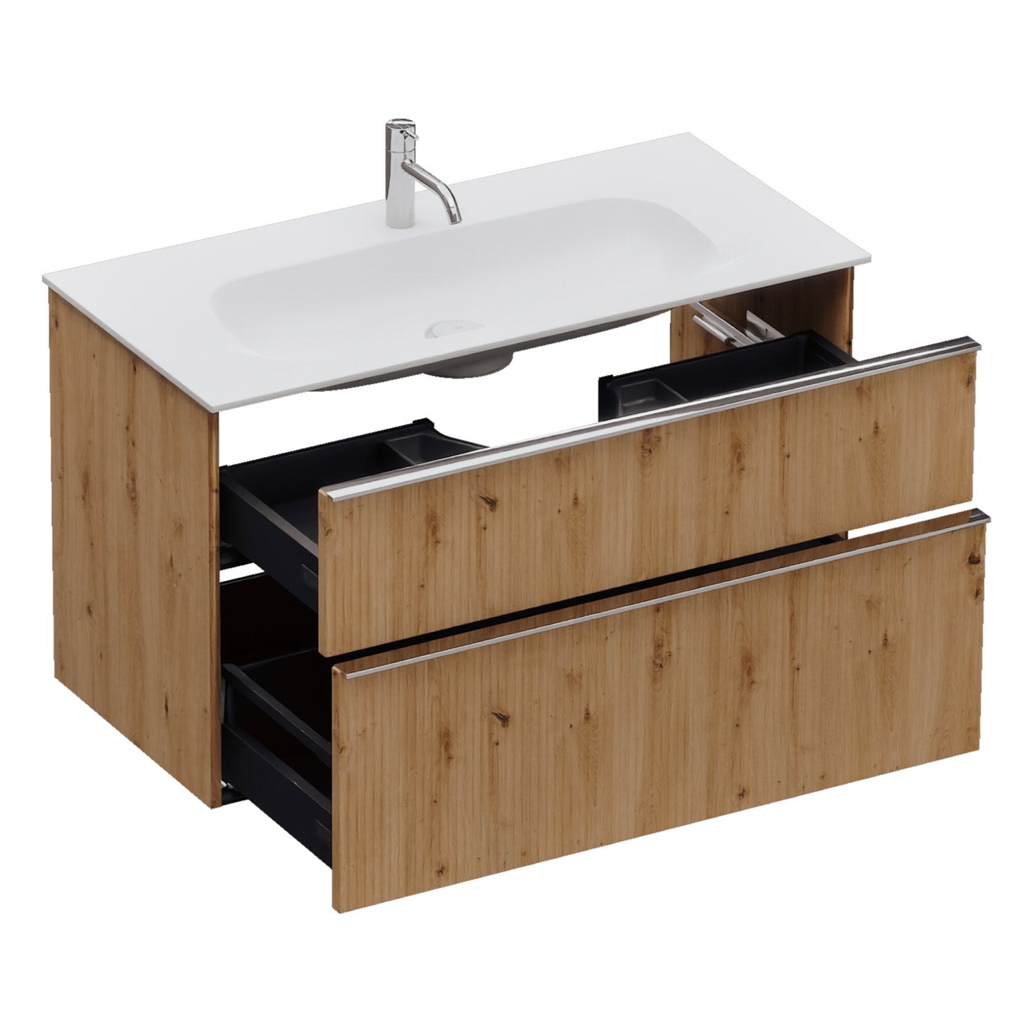 - 1 Schublade oben, 35 cm tief, mit vertikaler Struktur inkl. Siphonausschnitt und Inneneinteilung