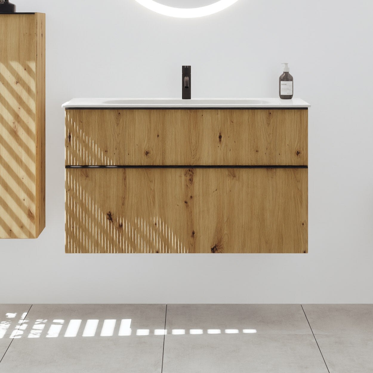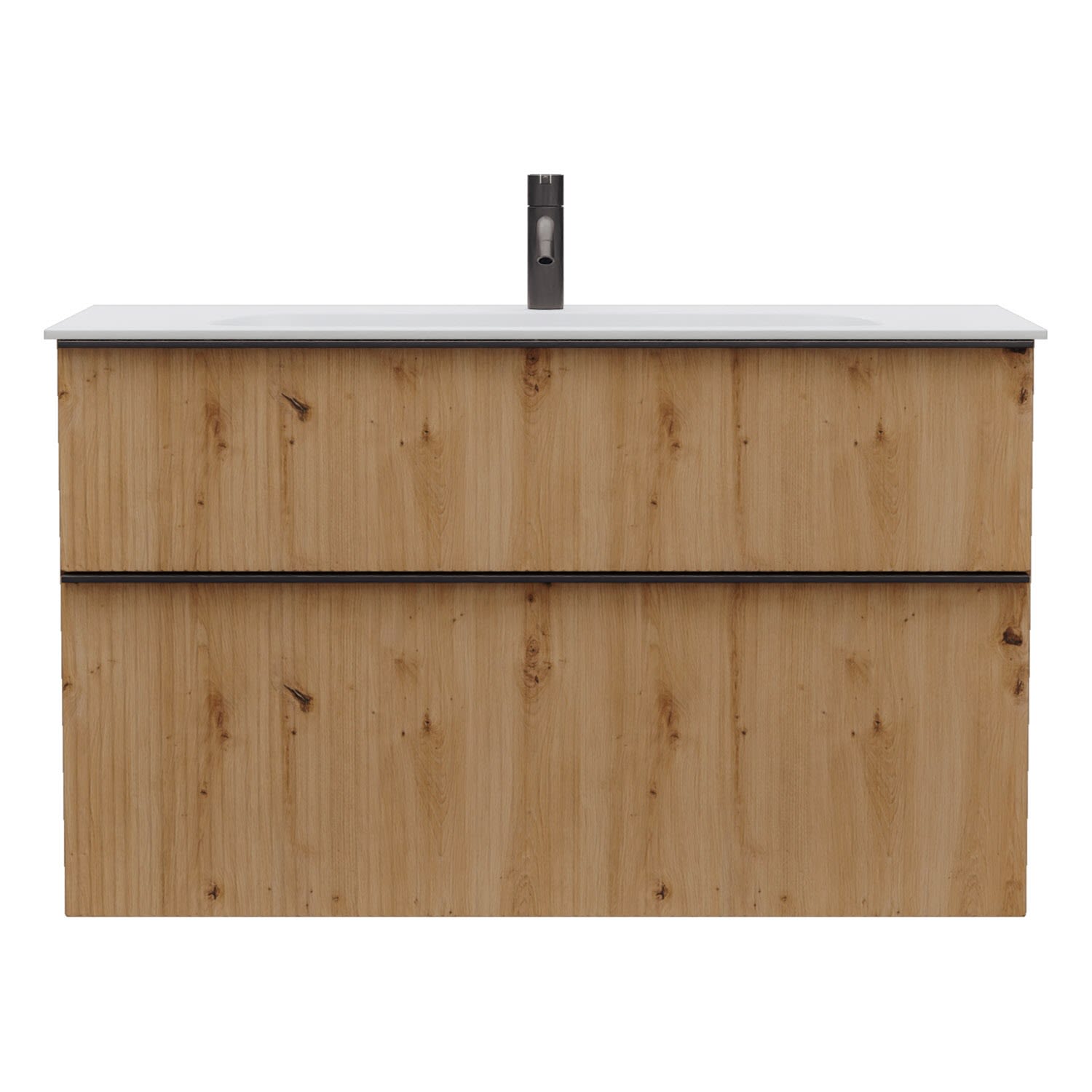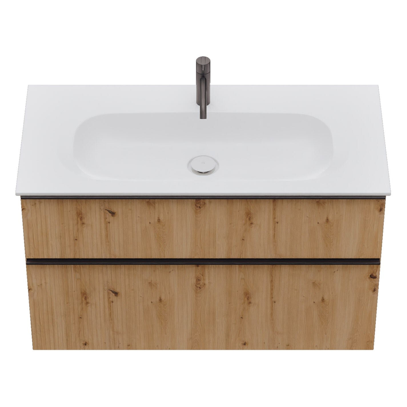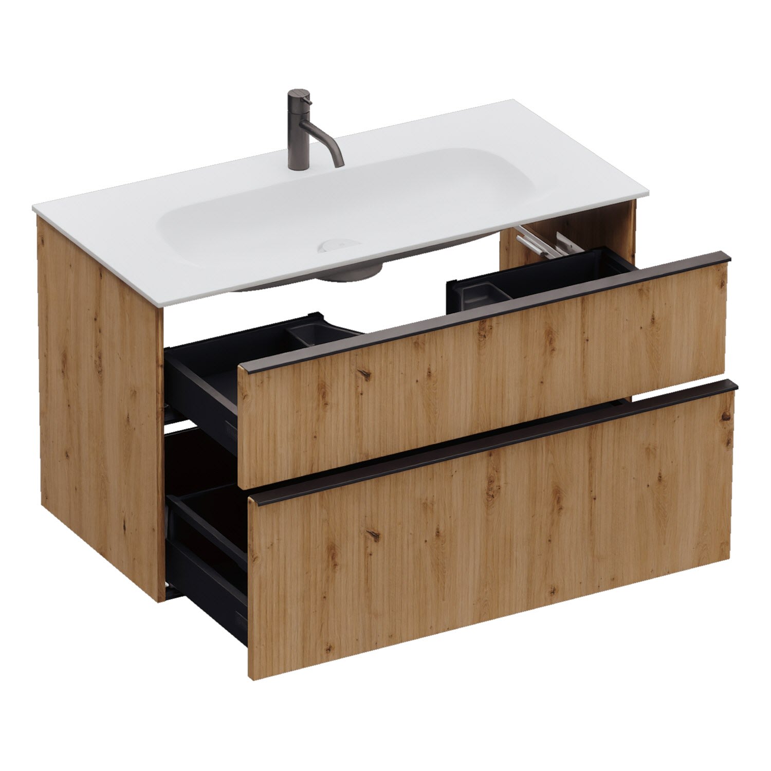 - 1 Schublade oben, 35 cm tief, mit vertikaler Struktur inkl. Siphonausschnitt und Inneneinteilung