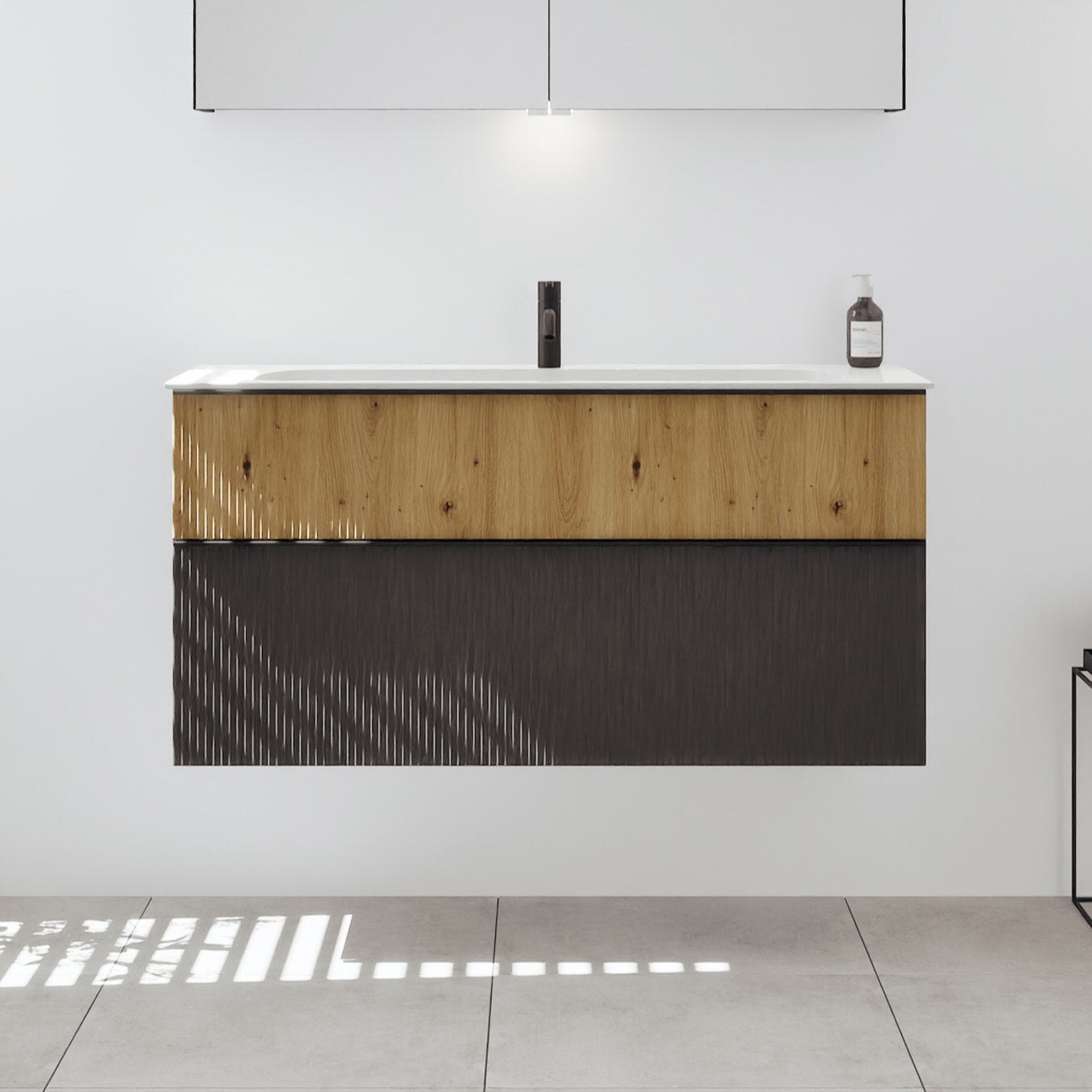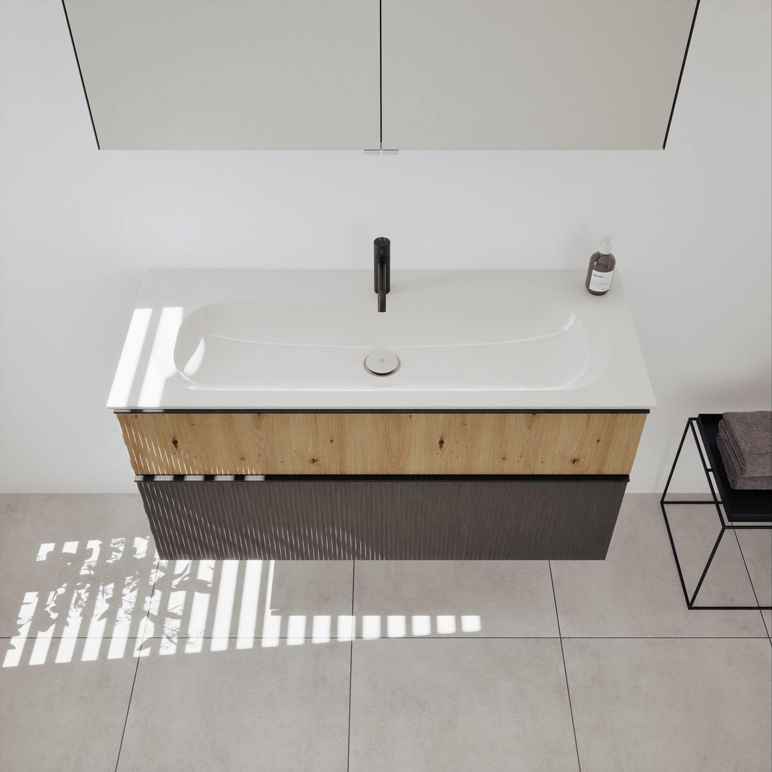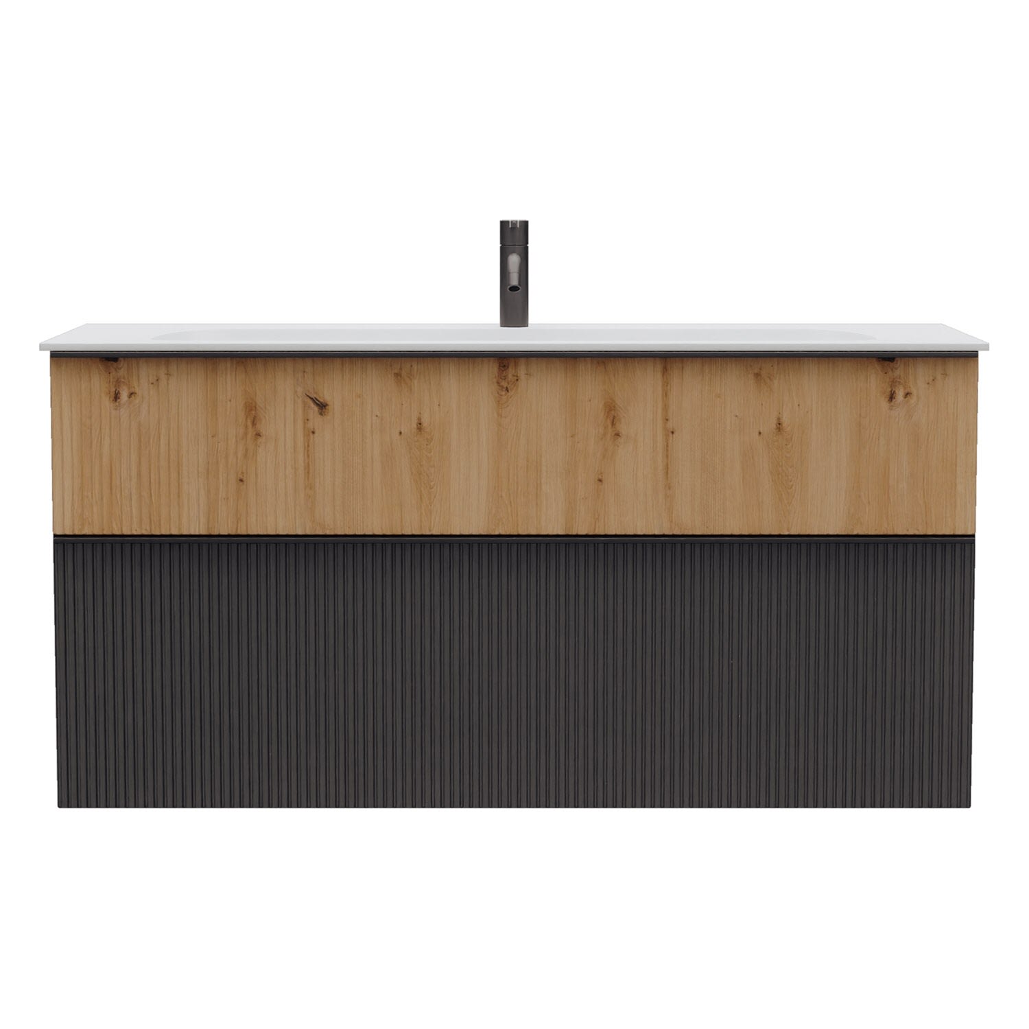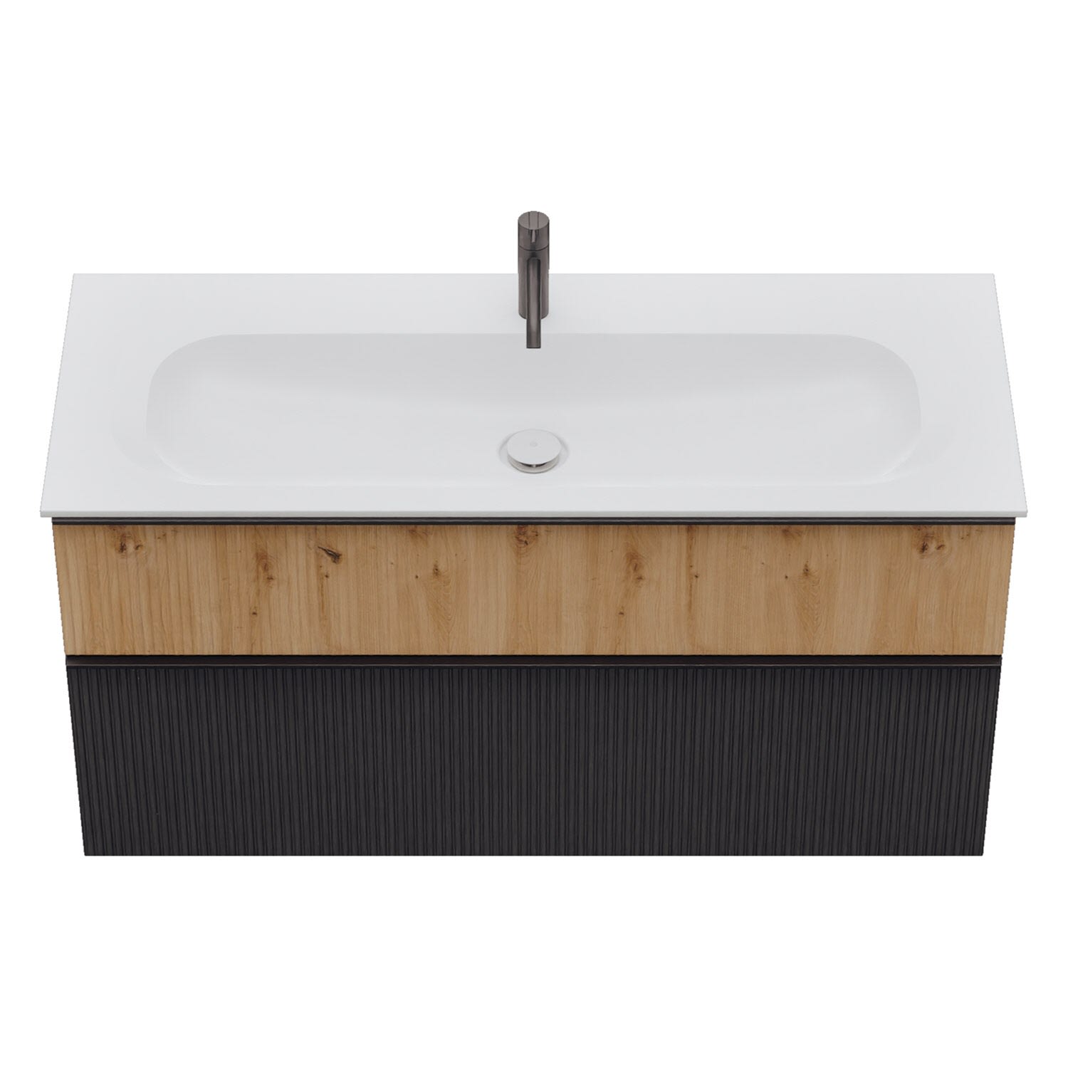- 1 Schublade oben, 35 cm tief, mit vertikaler Struktur inkl. Siphonausschnitt und Inneneinteilung