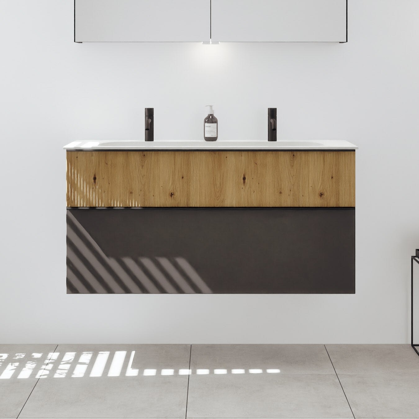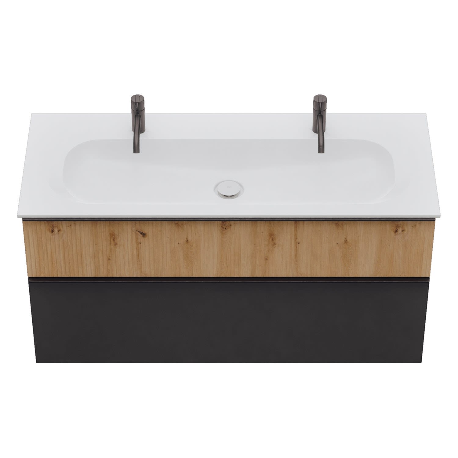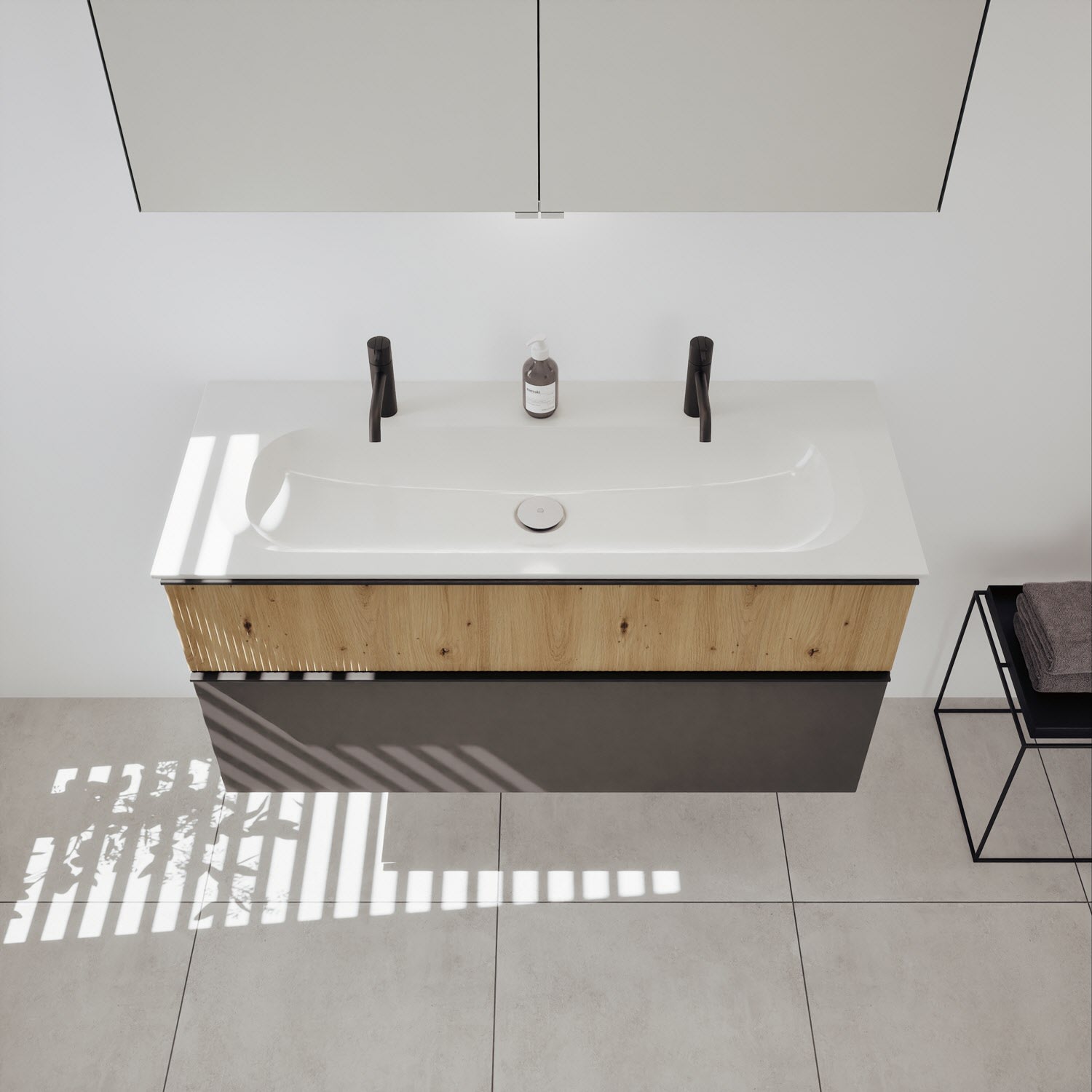 - 1 Schublade oben: 35 cm tief, mit vertikaler Struktur inkl. Siphonausschnitt und Inneneinteilung