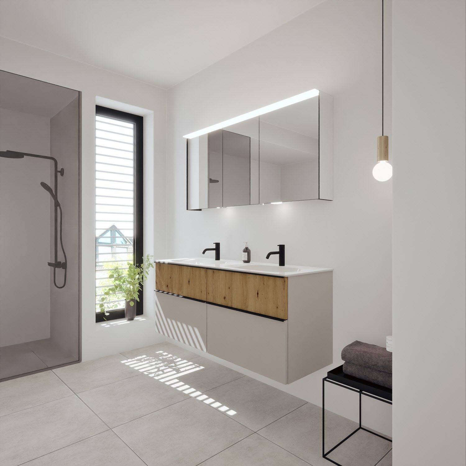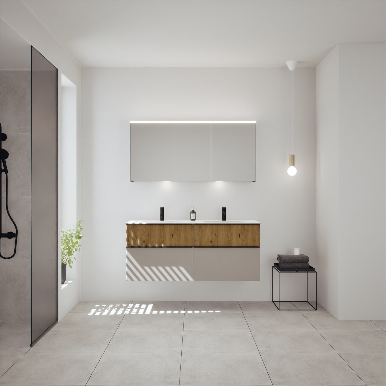 burgbad Fiumo 2.0 Spiegelschrank 140,6 cm mit LED-Aufsatzleuchte und Waschplatzbeleuchtung, 3 Spiegeltüren