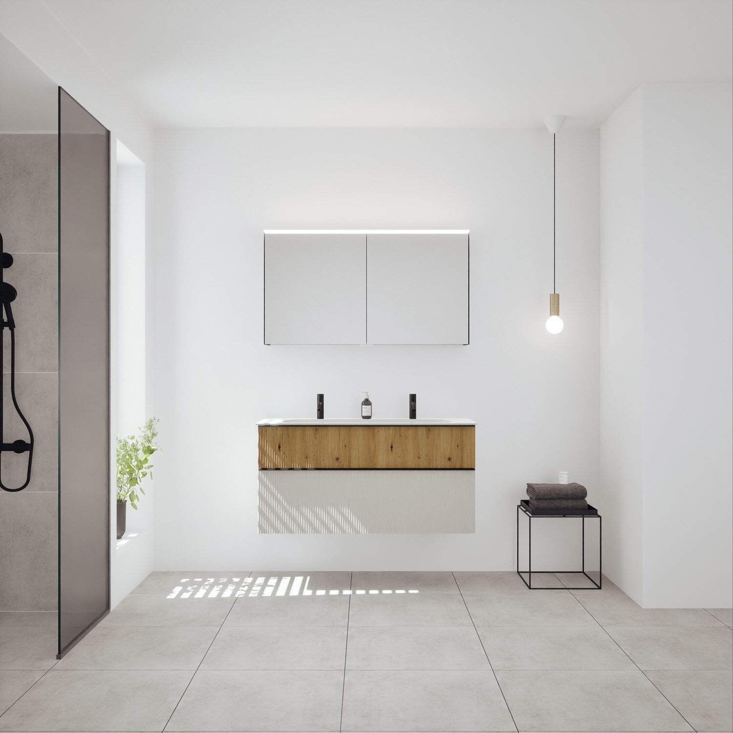 burgbad Fiumo 2.0 Spiegelschrank 120,6 cm mit LED-Aufsatzleuchte und Waschplatzbeleuchtung, 2 Spiegeltüren