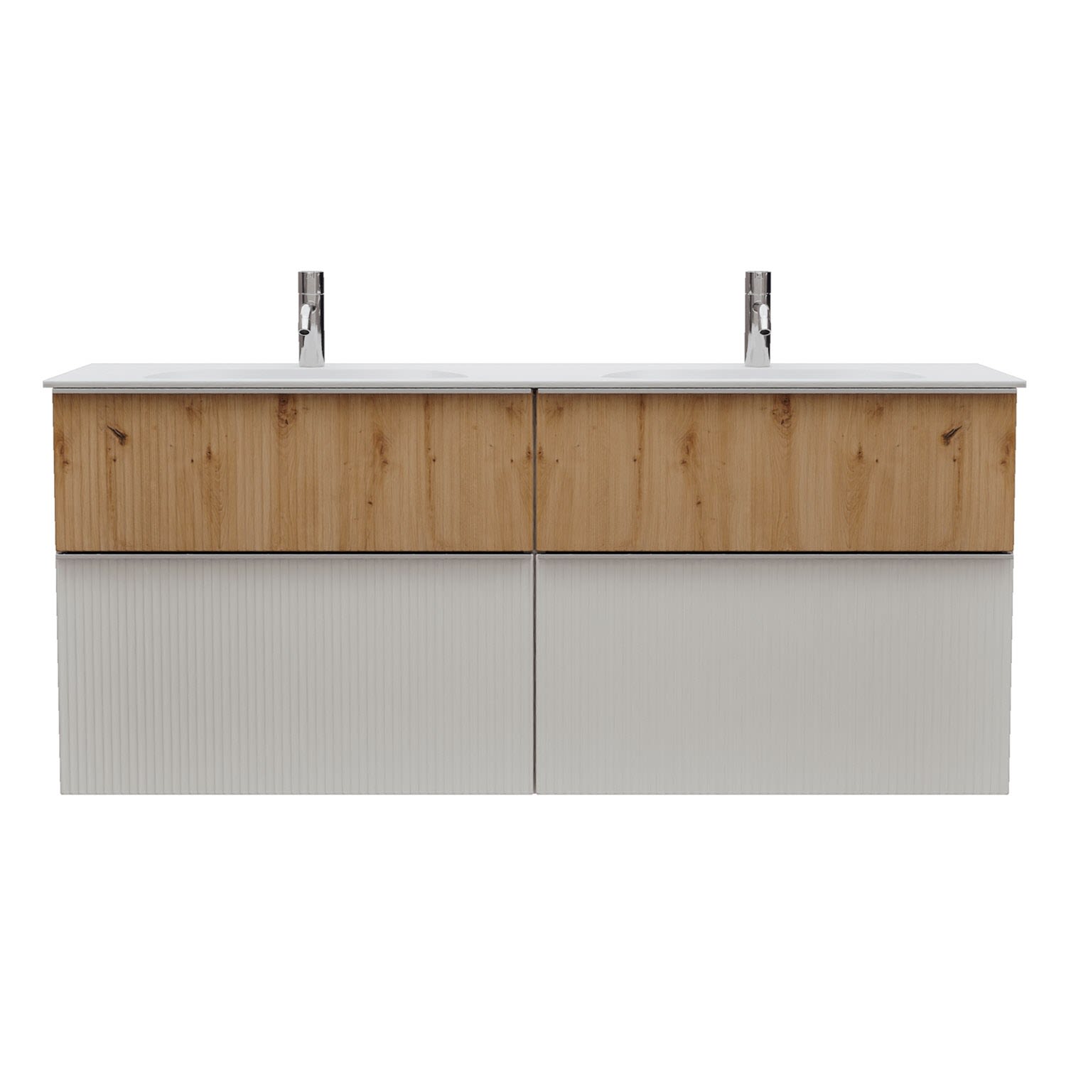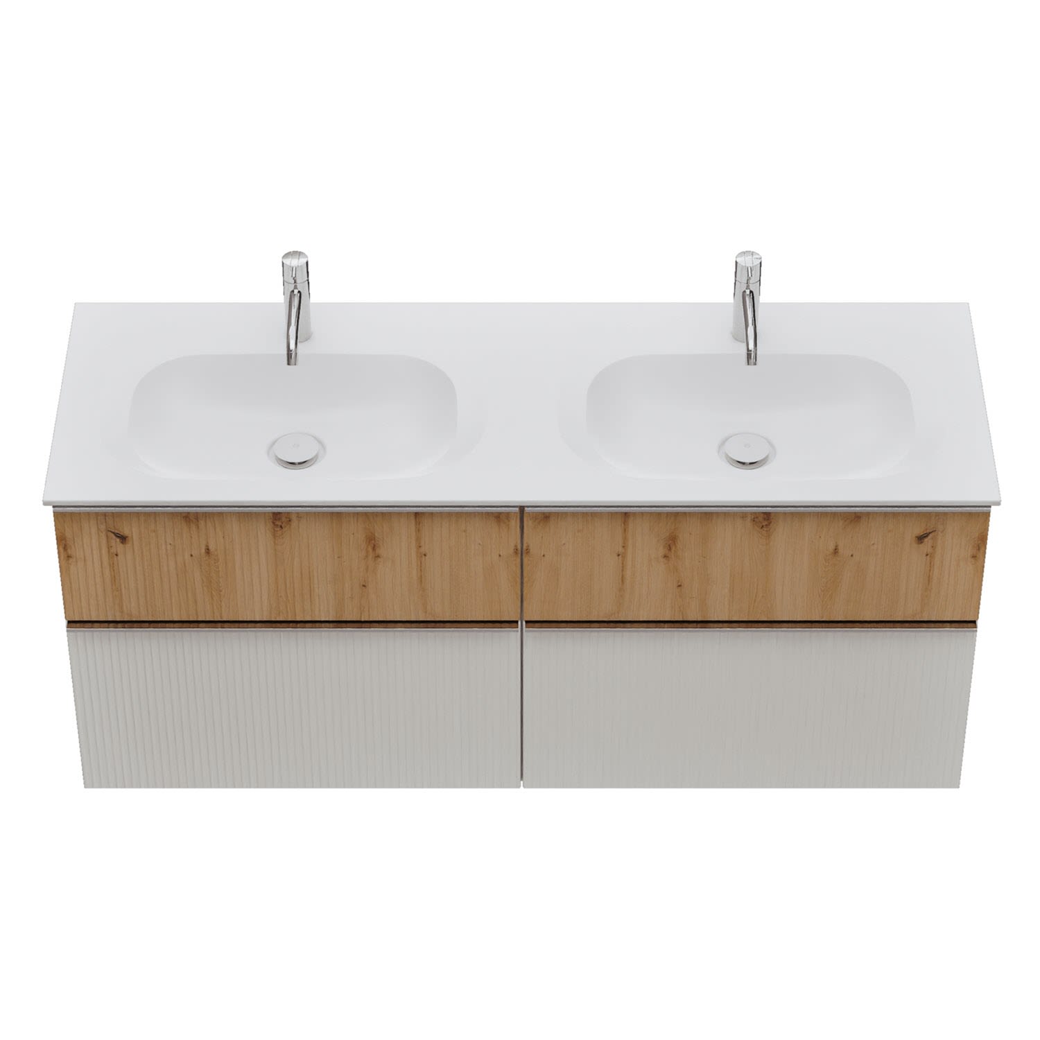 - 2 Schubladen oben, 35 cm tief, mit vertikaler Struktur inkl. mit Siphonausschnitt und Inneneinteilung