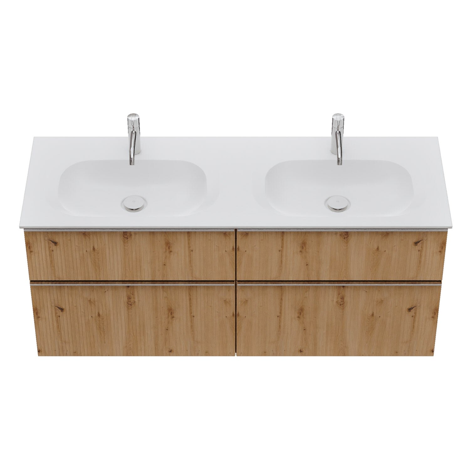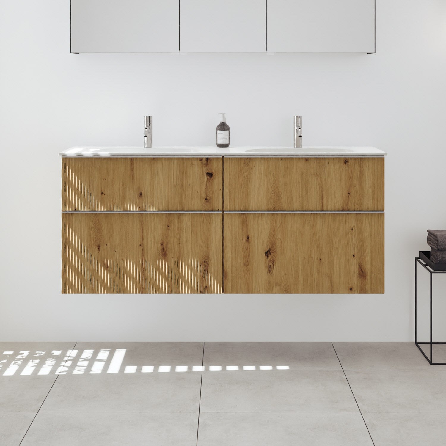 - 2 Schubladen oben, 35 cm tief, mit vertikaler Struktur inkl. mit Siphonausschnitt und Inneneinteilung