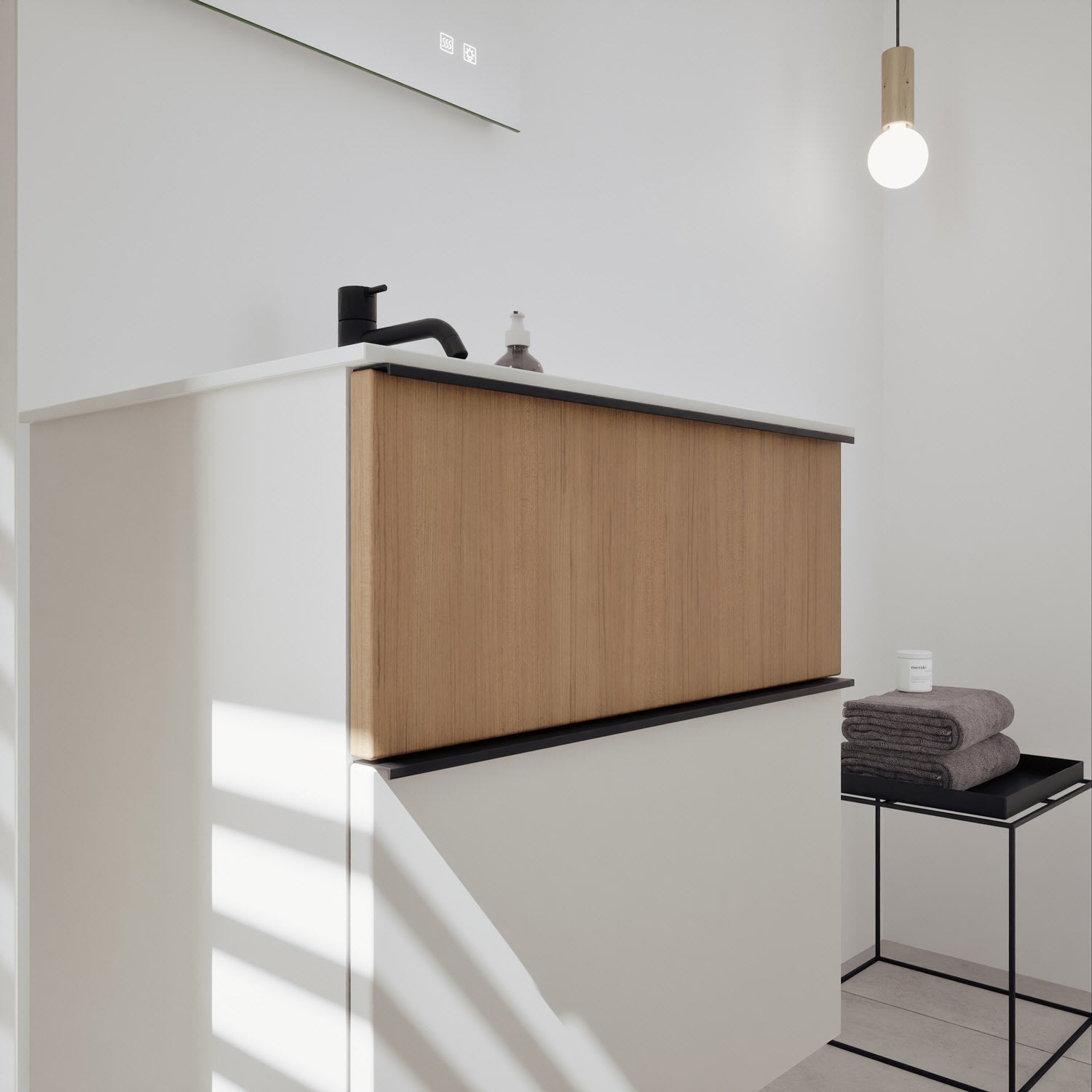- 1 Schublade oben: 35 cm tief, mit Siphonausschnitt und Inneneinteilung
