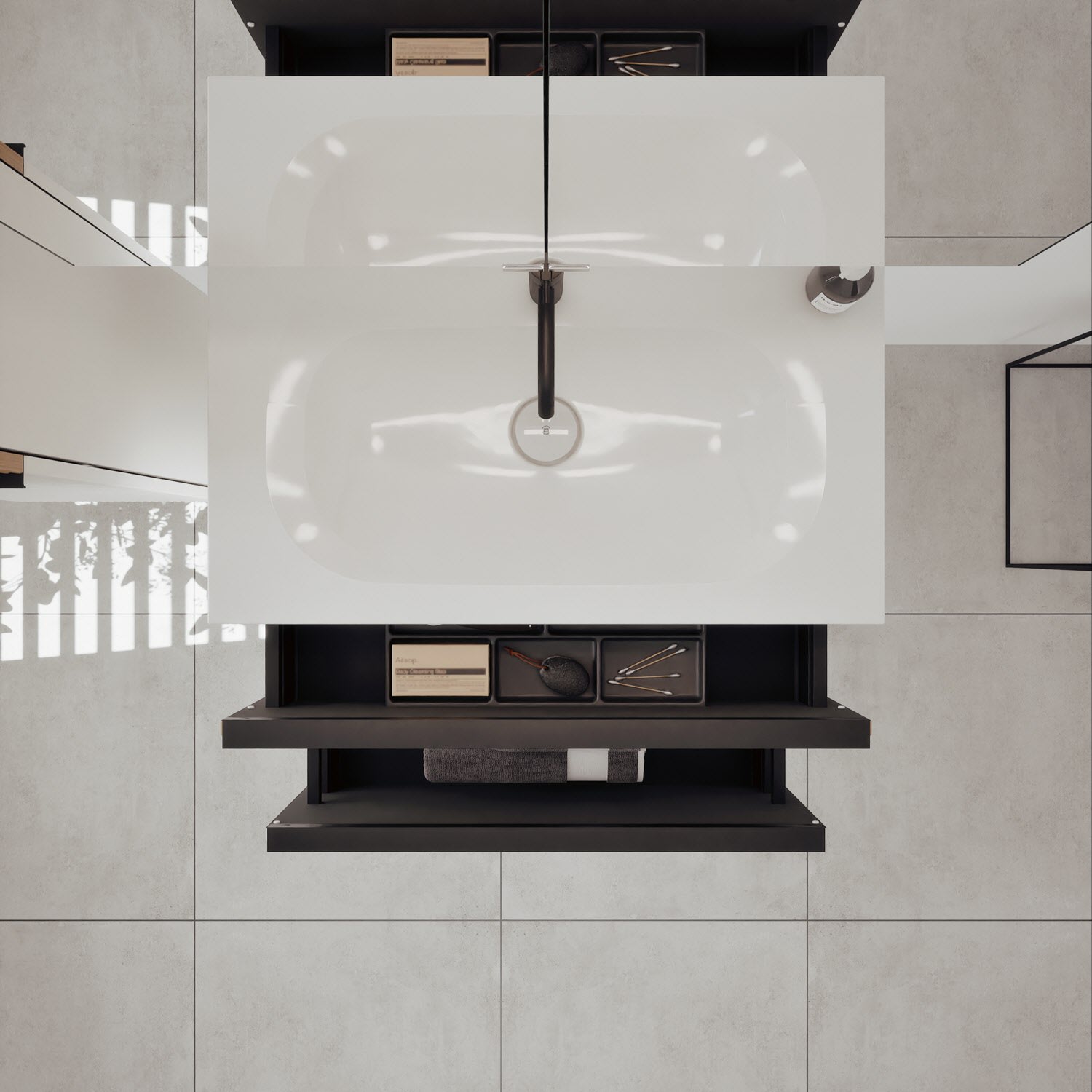 - 1 Schublade oben: 35 cm tief, mit Siphonausschnitt und Inneneinteilung