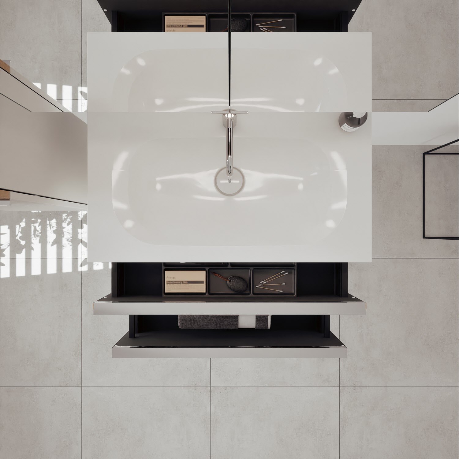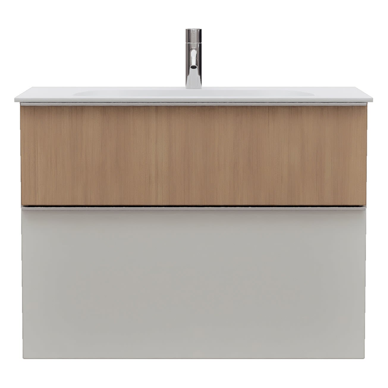 - 1 Schublade oben: 35 cm tief, mit Siphonausschnitt und Inneneinteilung