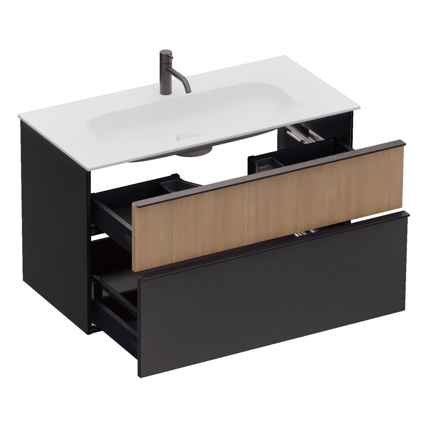 - 1 Schublade oben, 35 cm tief, mit Siphonausschnitt und Inneneinteilung