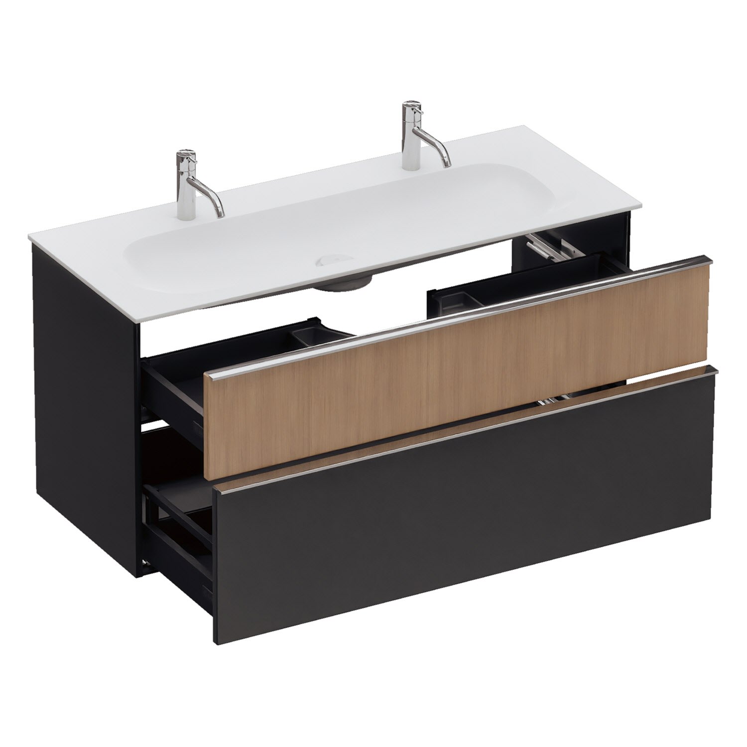 - 1 Schublade oben, 35 cm tief, mit Siphonausschnitt und Inneneinteilung
