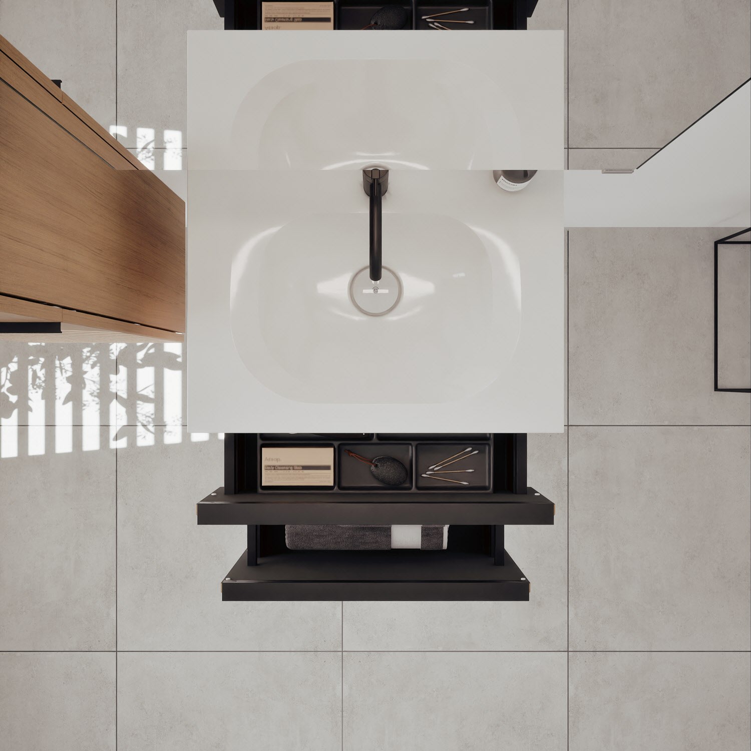 - 1 Schublade oben, 35 cm tief, mit Siphonausschnitt und Inneneinteilung