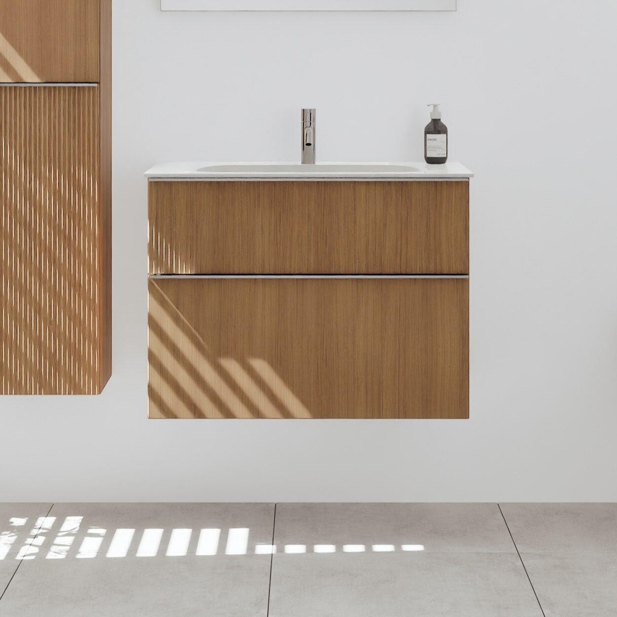 - 1 Schublade oben, 35 cm tief, mit vertikaler Struktur inkl. Siphonausschnitt und Inneneinteilung