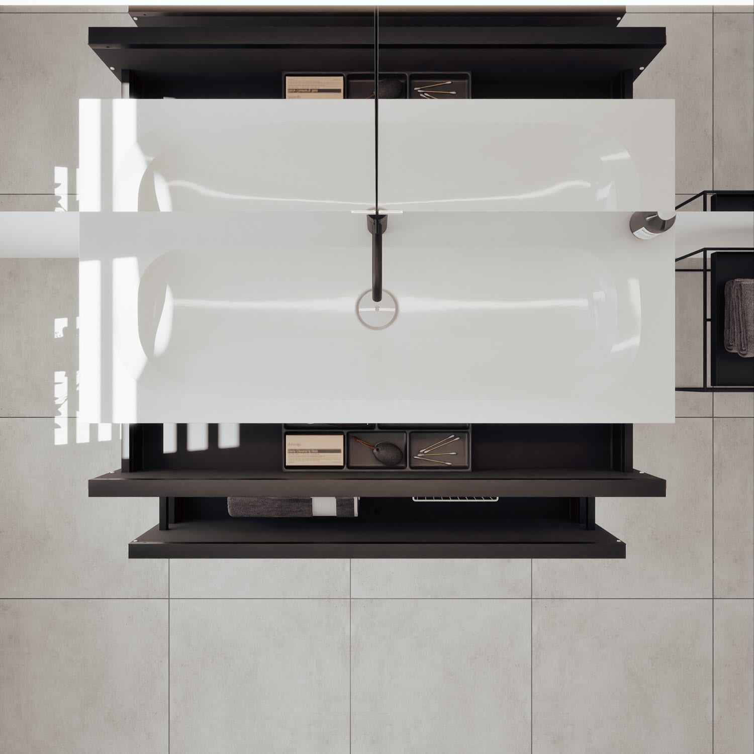 - 1 Schublade oben: 35 cm tief, mit vertikaler Struktur inkl. Siphonausschnitt und Inneneinteilung