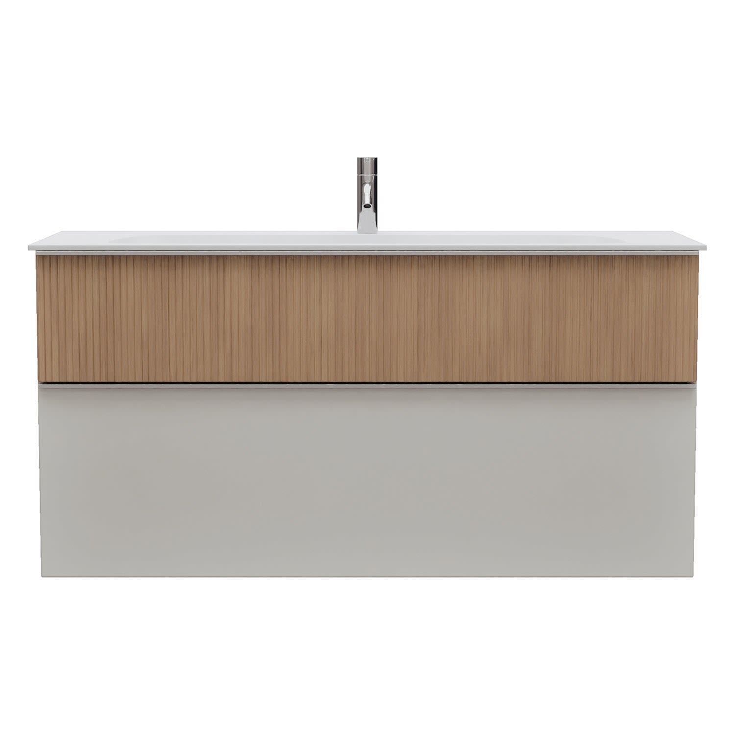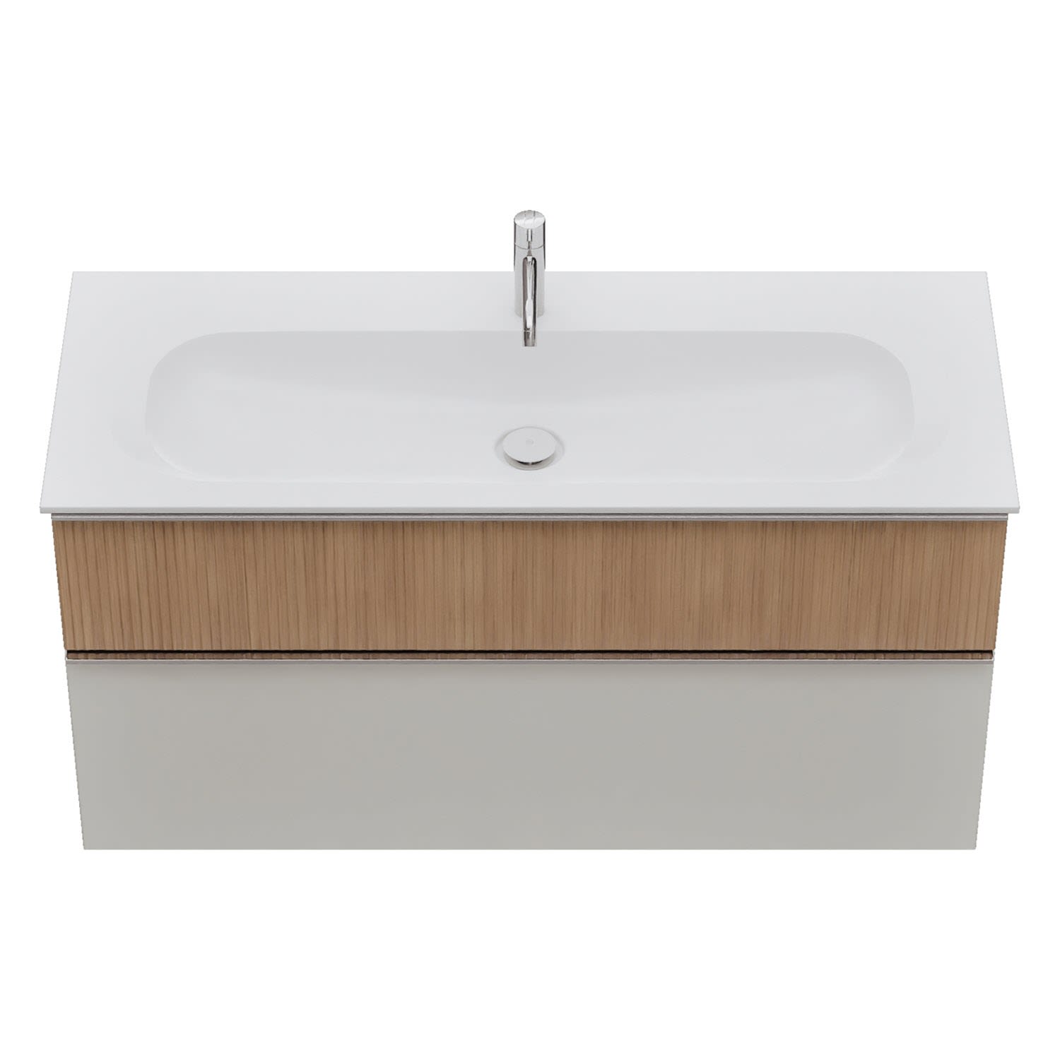 - 1 Schublade oben: 35 cm tief, mit vertikaler Struktur inkl. Siphonausschnitt und Inneneinteilung