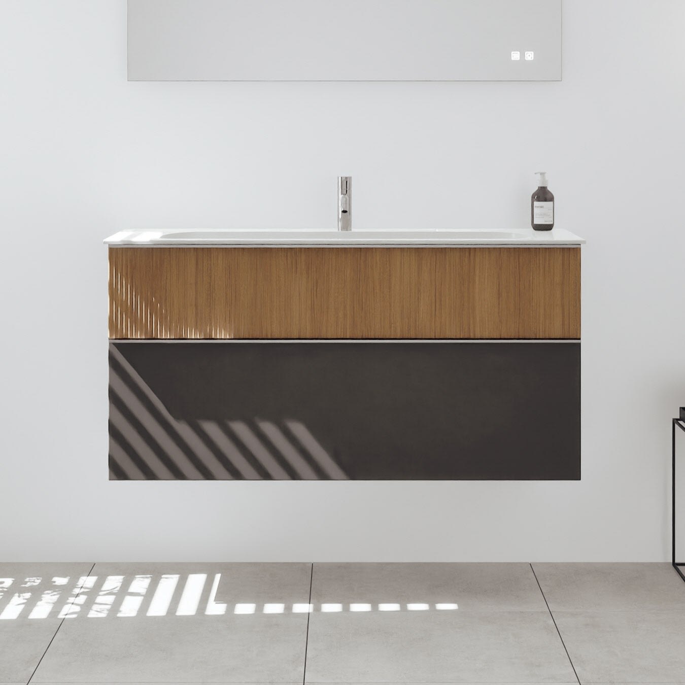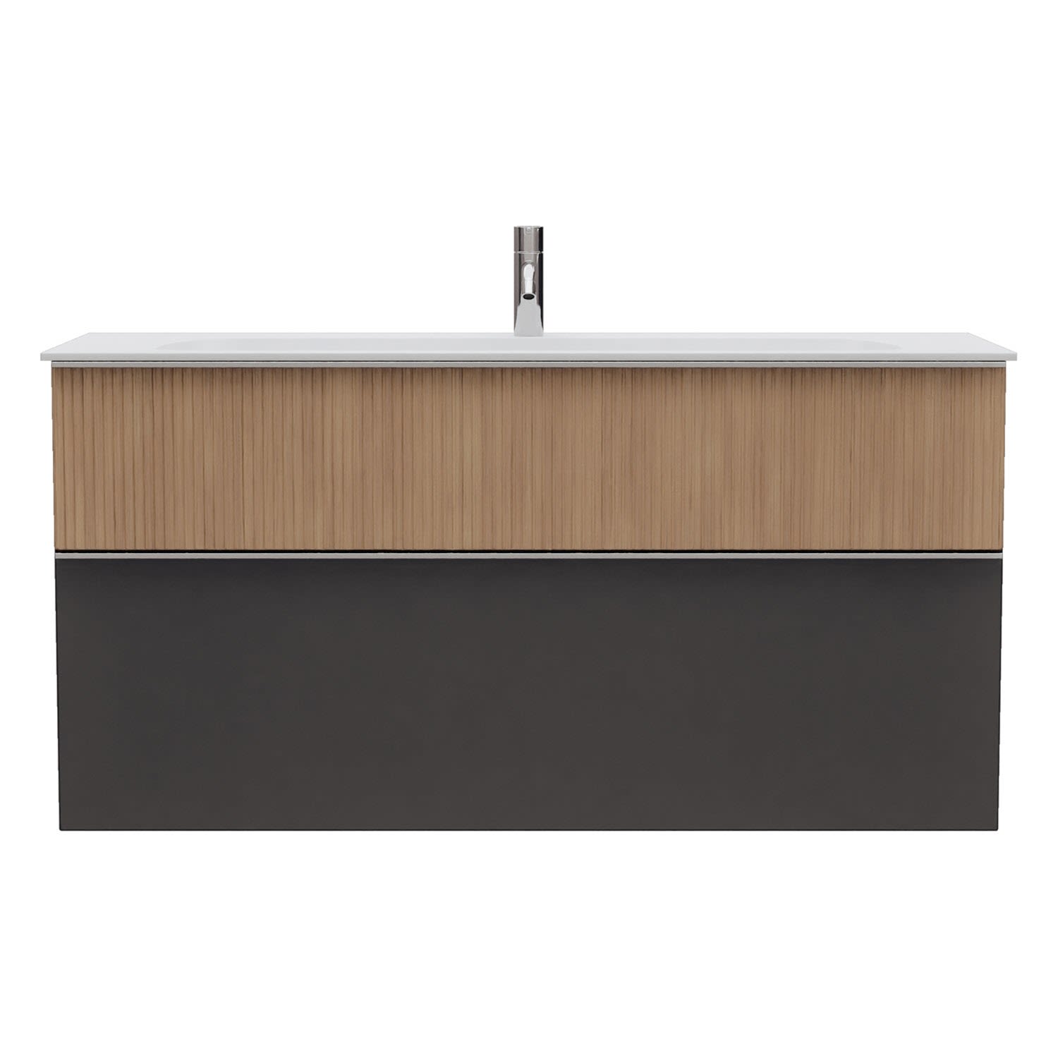 - 1 Schublade oben: 35 cm tief, mit vertikaler Struktur inkl. Siphonausschnitt und Inneneinteilung