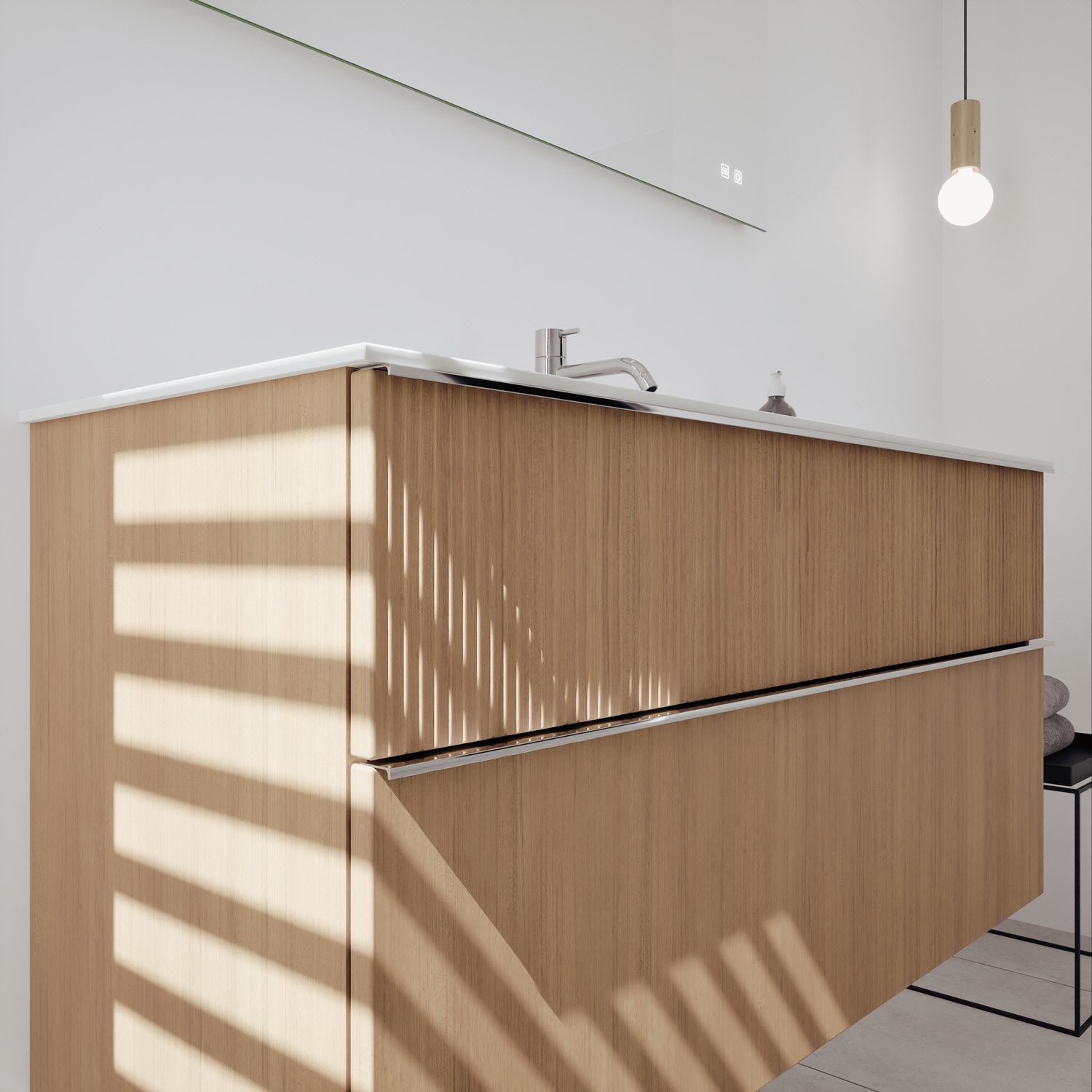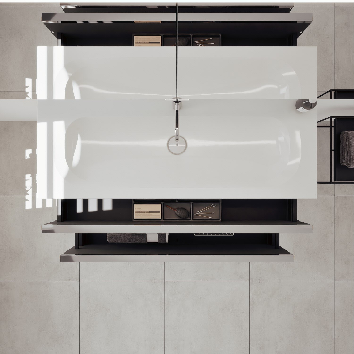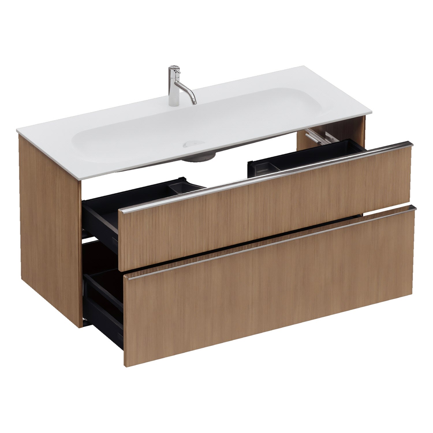 - 1 Schublade oben: 35 cm tief, mit vertikaler Struktur inkl. Siphonausschnitt und Inneneinteilung