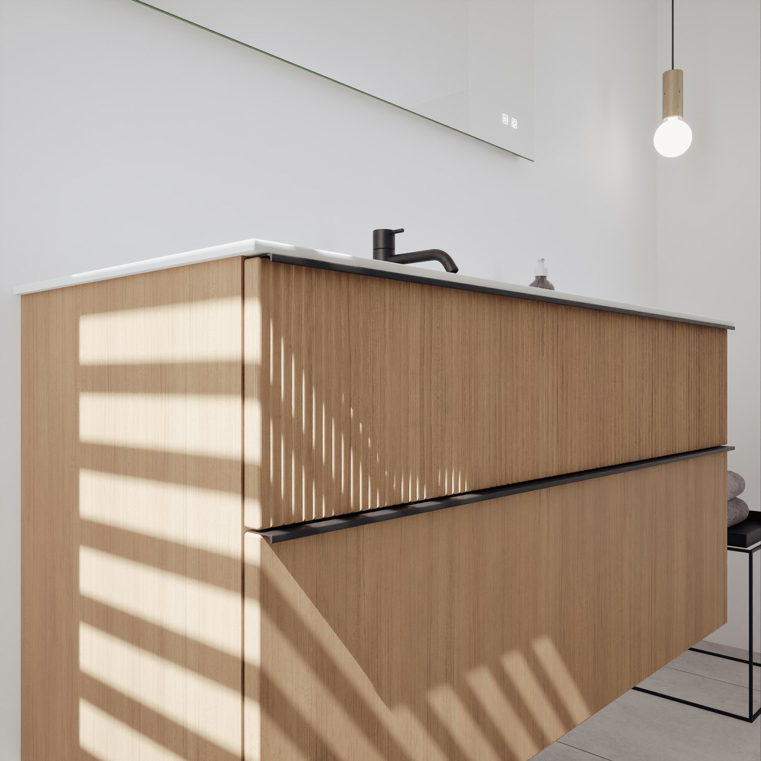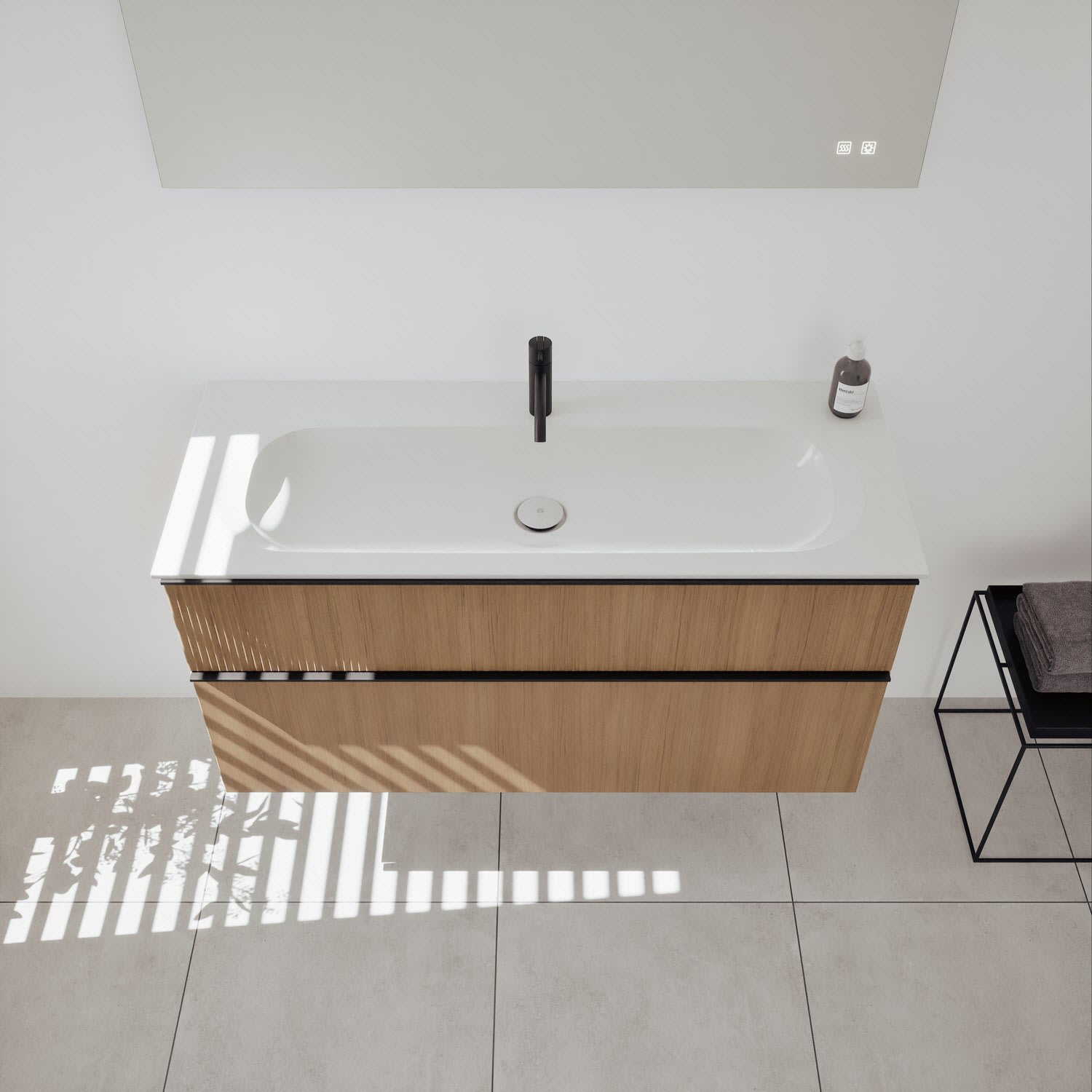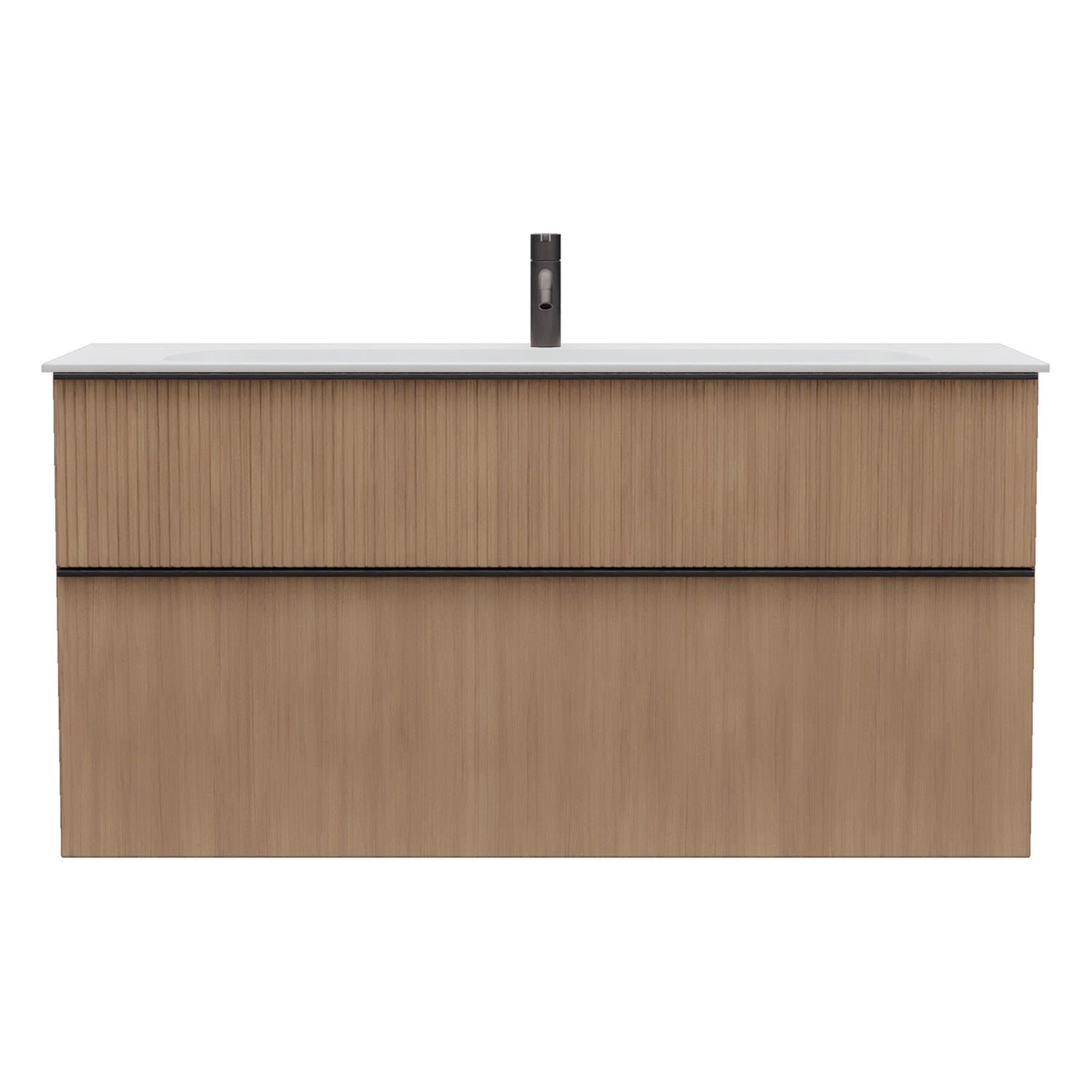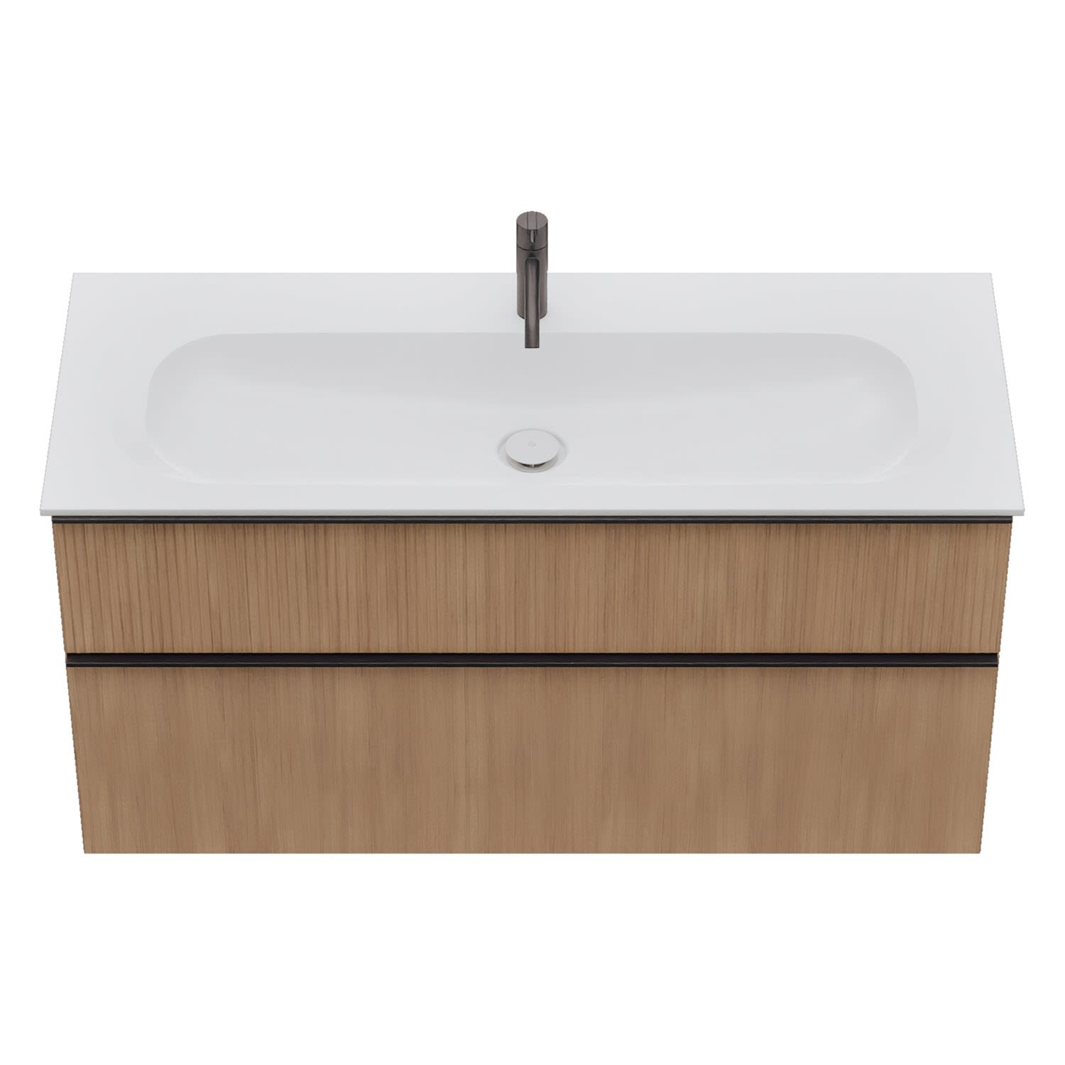 - 1 Schublade oben: 35 cm tief, mit vertikaler Struktur inkl. Siphonausschnitt und Inneneinteilung