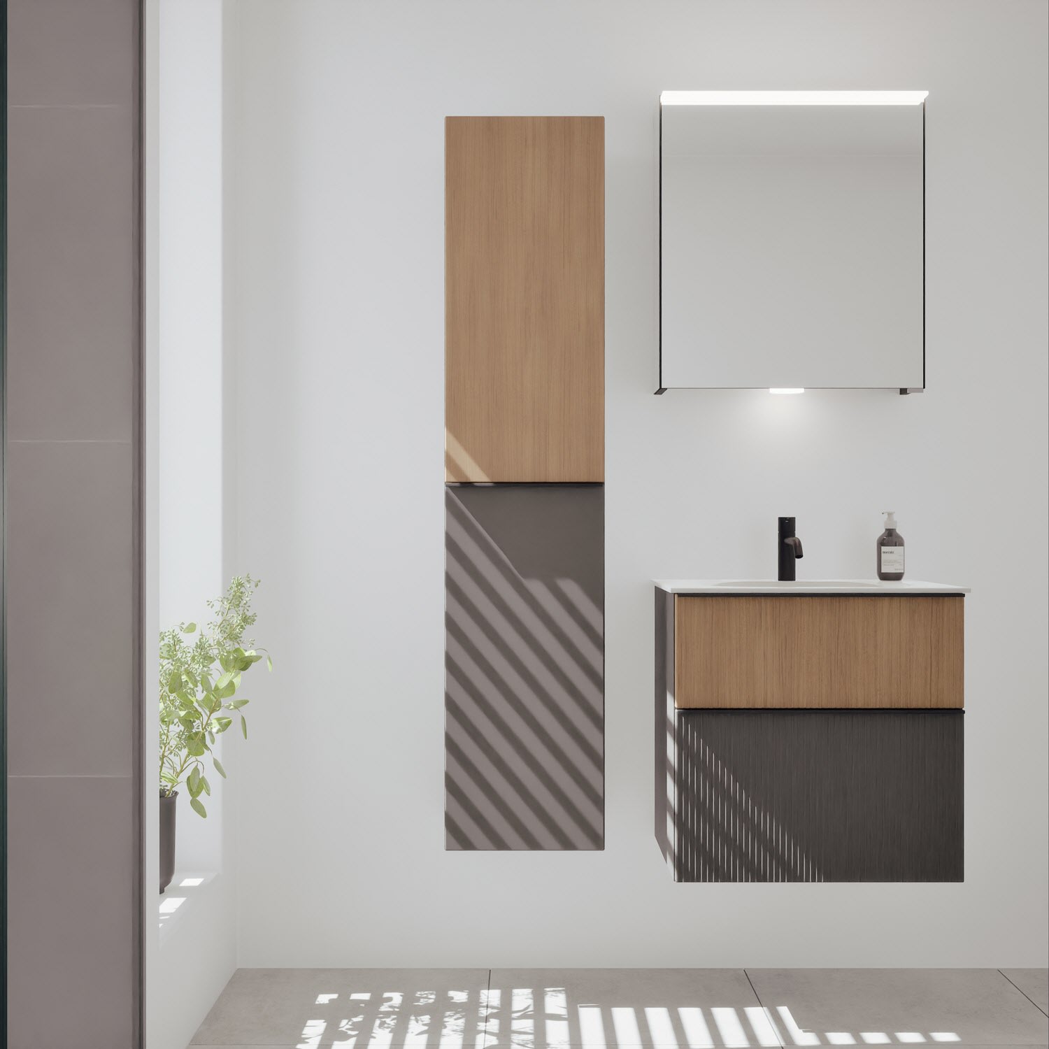 - 1 Schublade oben, 35 cm tief, mit vertikaler Struktur inkl. Siphonausschnitt und Inneneinteilung