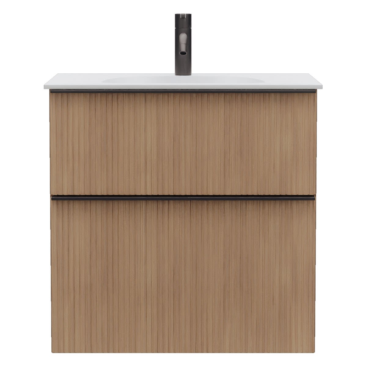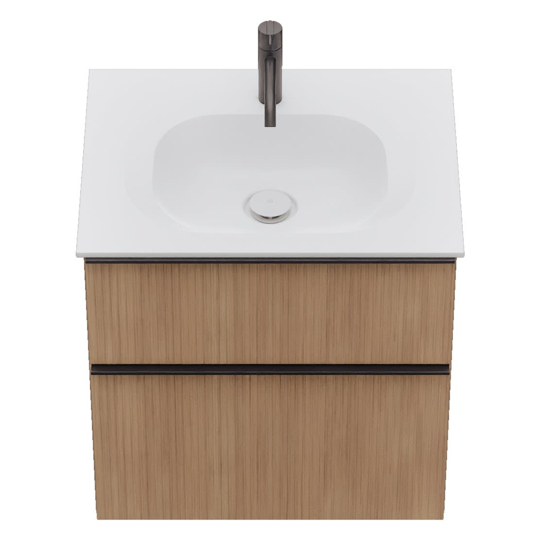 - 1 Schublade oben, 35 cm tief, mit vertikaler Struktur inkl. Siphonausschnitt und Inneneinteilung