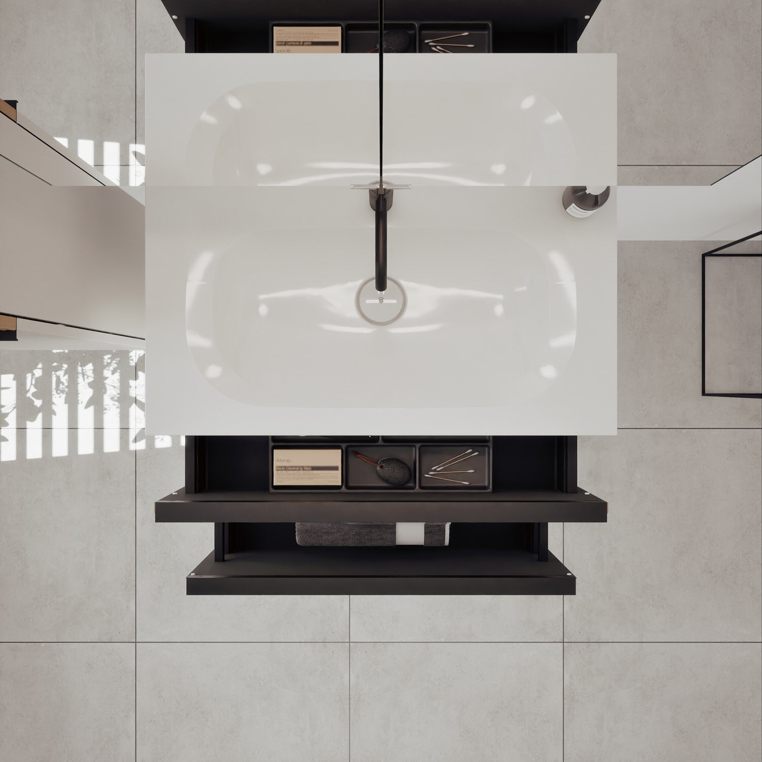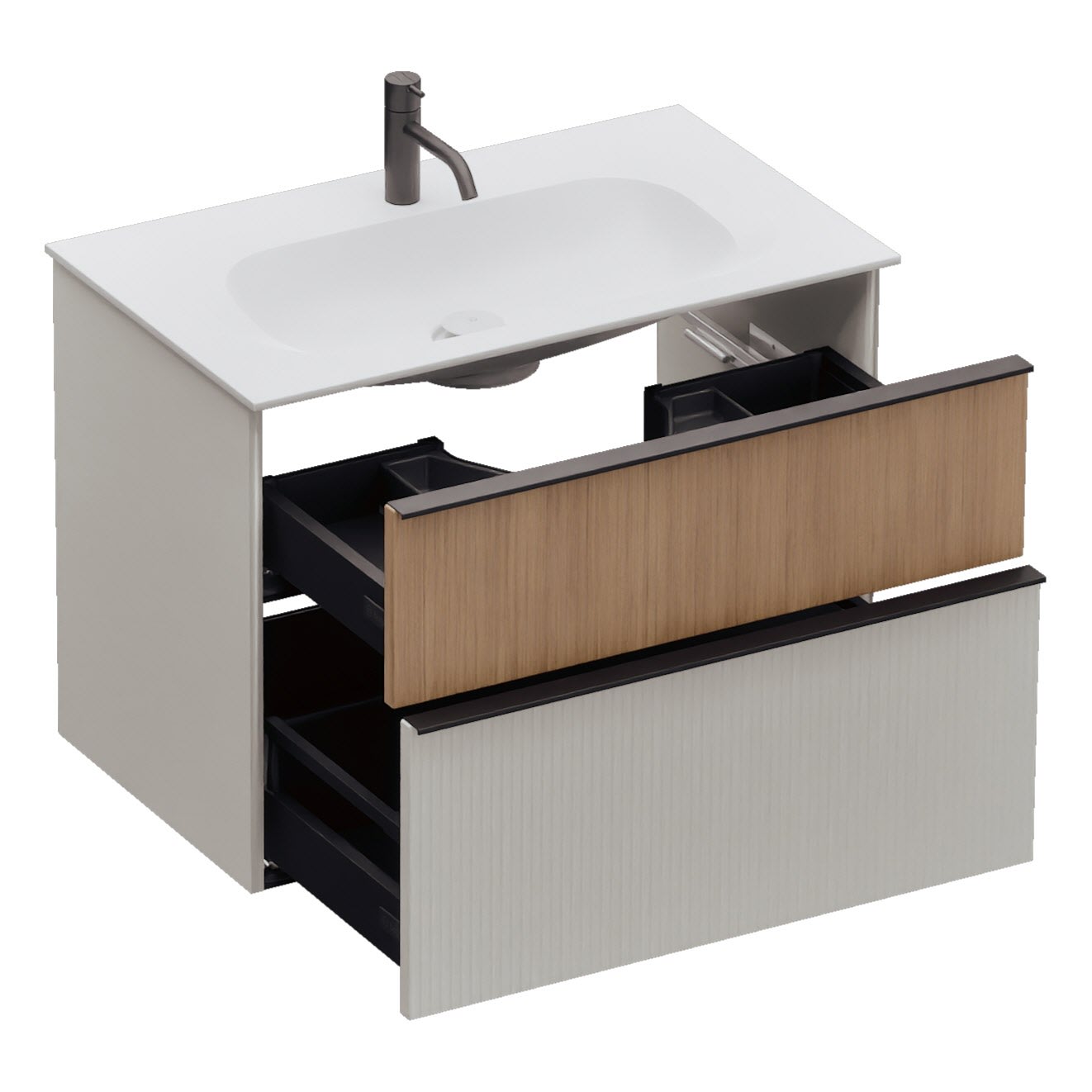 - 1 Schublade oben: 35 cm tief, mit vertikaler Struktur inkl. Siphonausschnitt und Inneneinteilung
