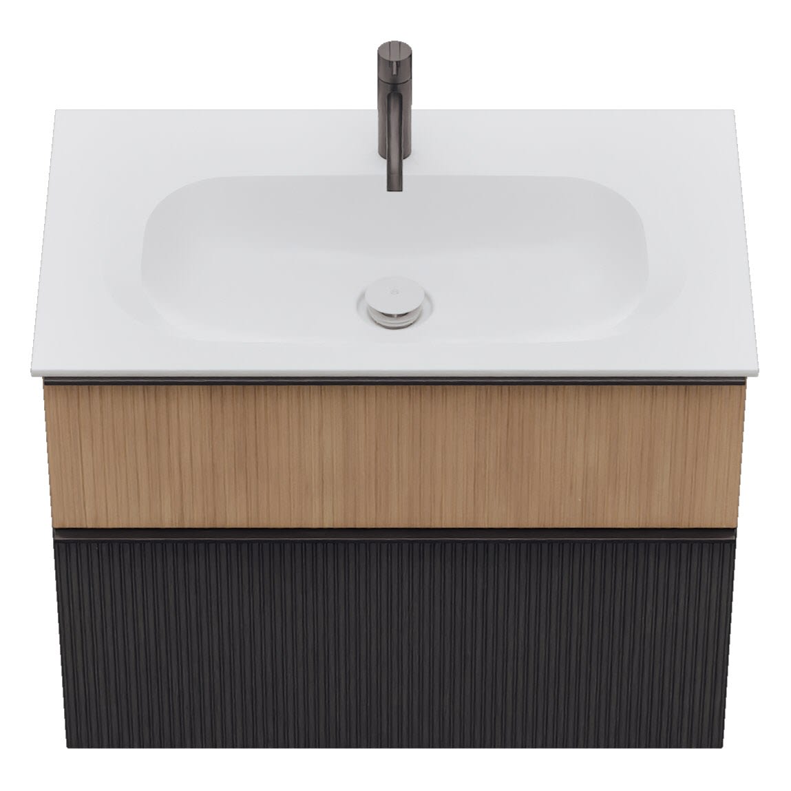 - 1 Schublade oben: 35 cm tief, mit vertikaler Struktur inkl. Siphonausschnitt und Inneneinteilung
