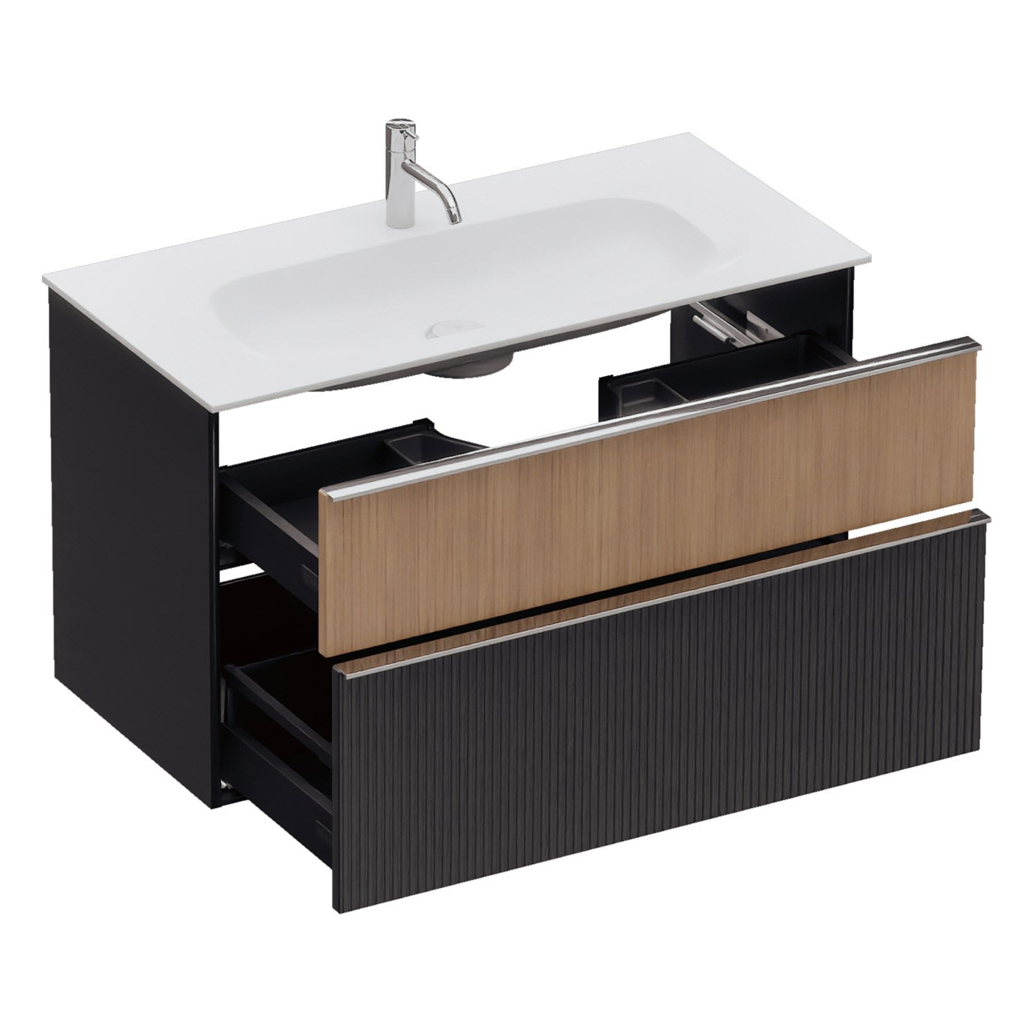 - 1 Schublade oben, 35 cm tief, mit vertikaler Struktur inkl. Siphonausschnitt und Inneneinteilung
