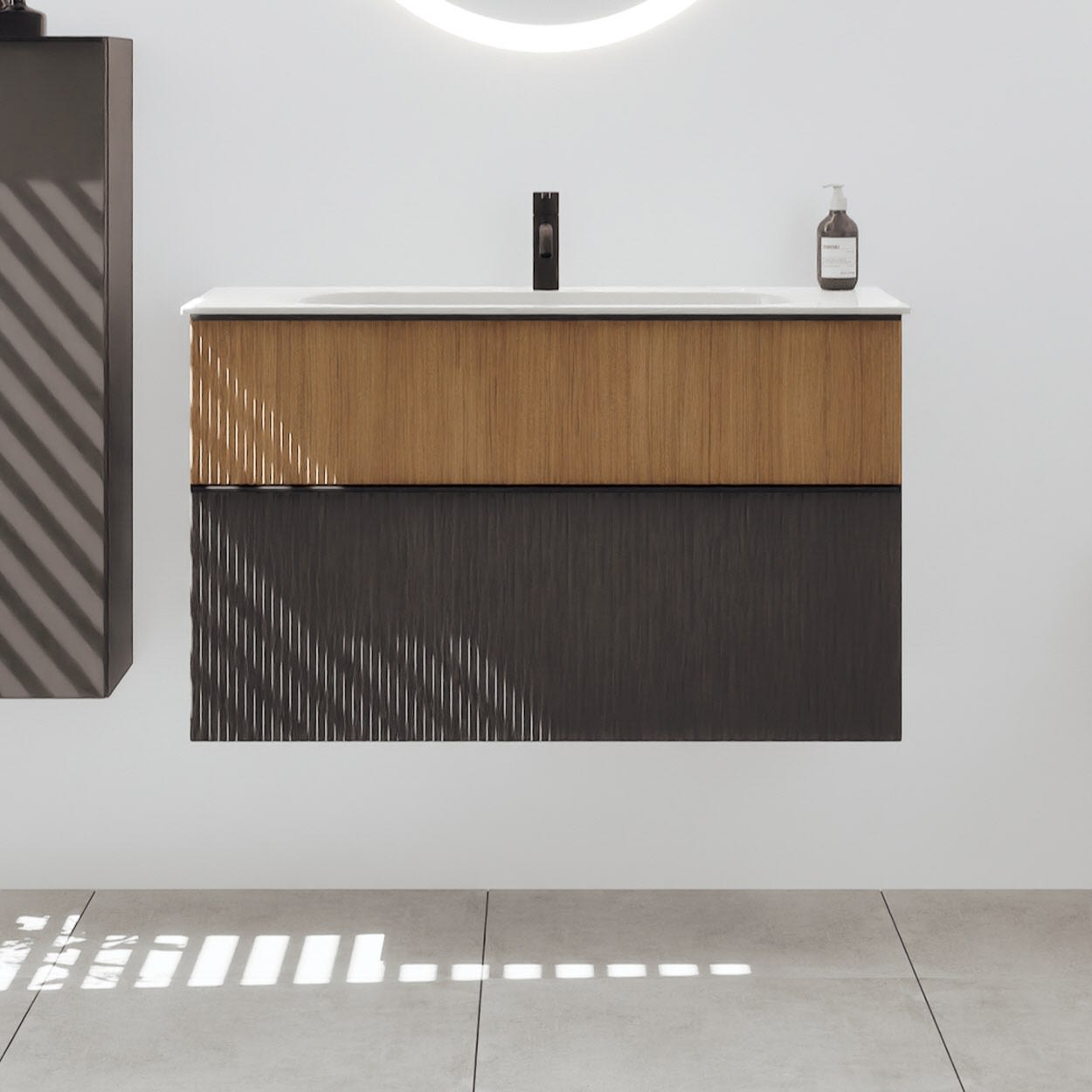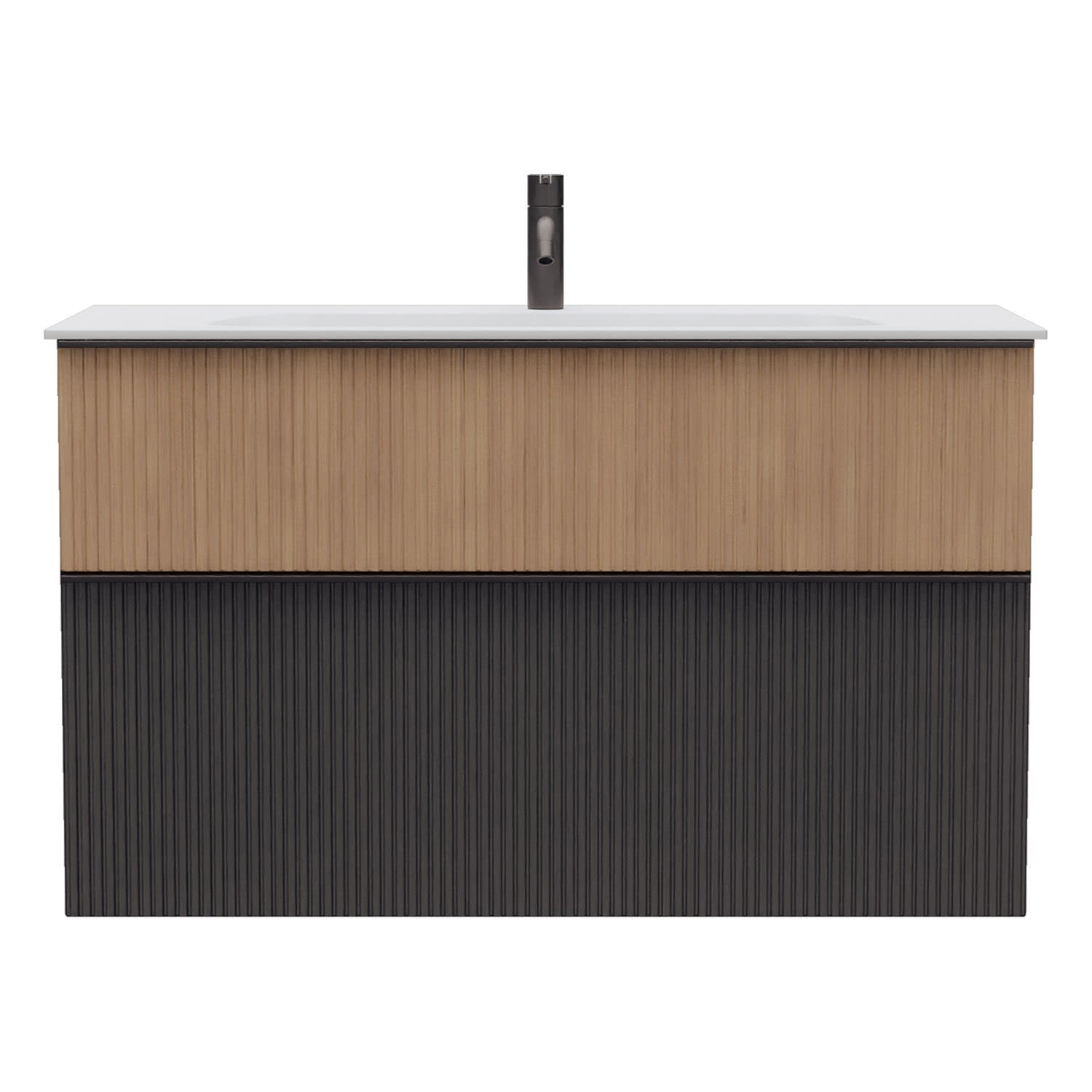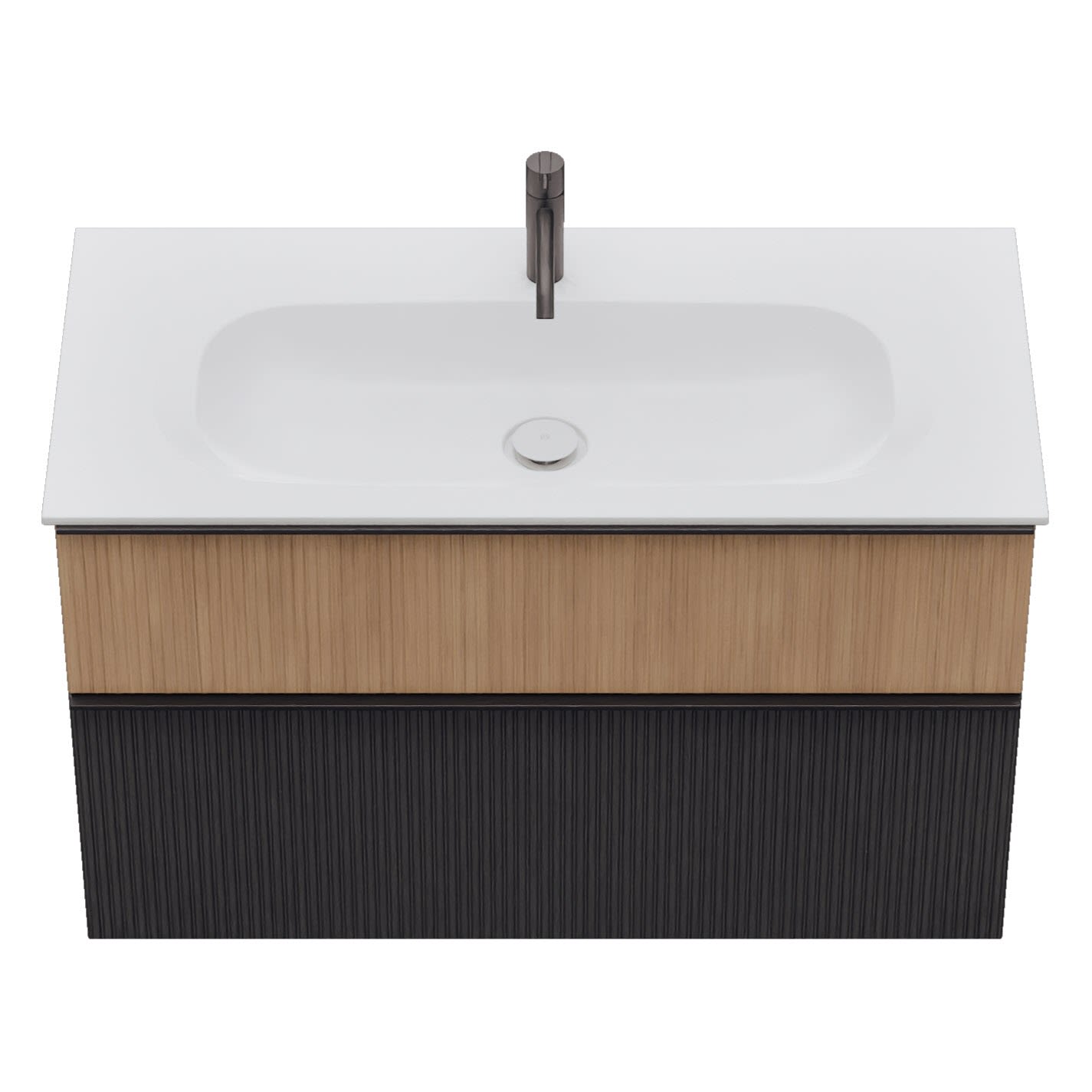 - 1 Schublade oben, 35 cm tief, mit vertikaler Struktur inkl. Siphonausschnitt und Inneneinteilung