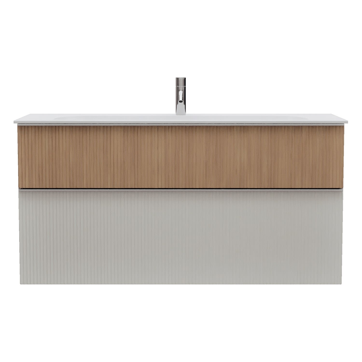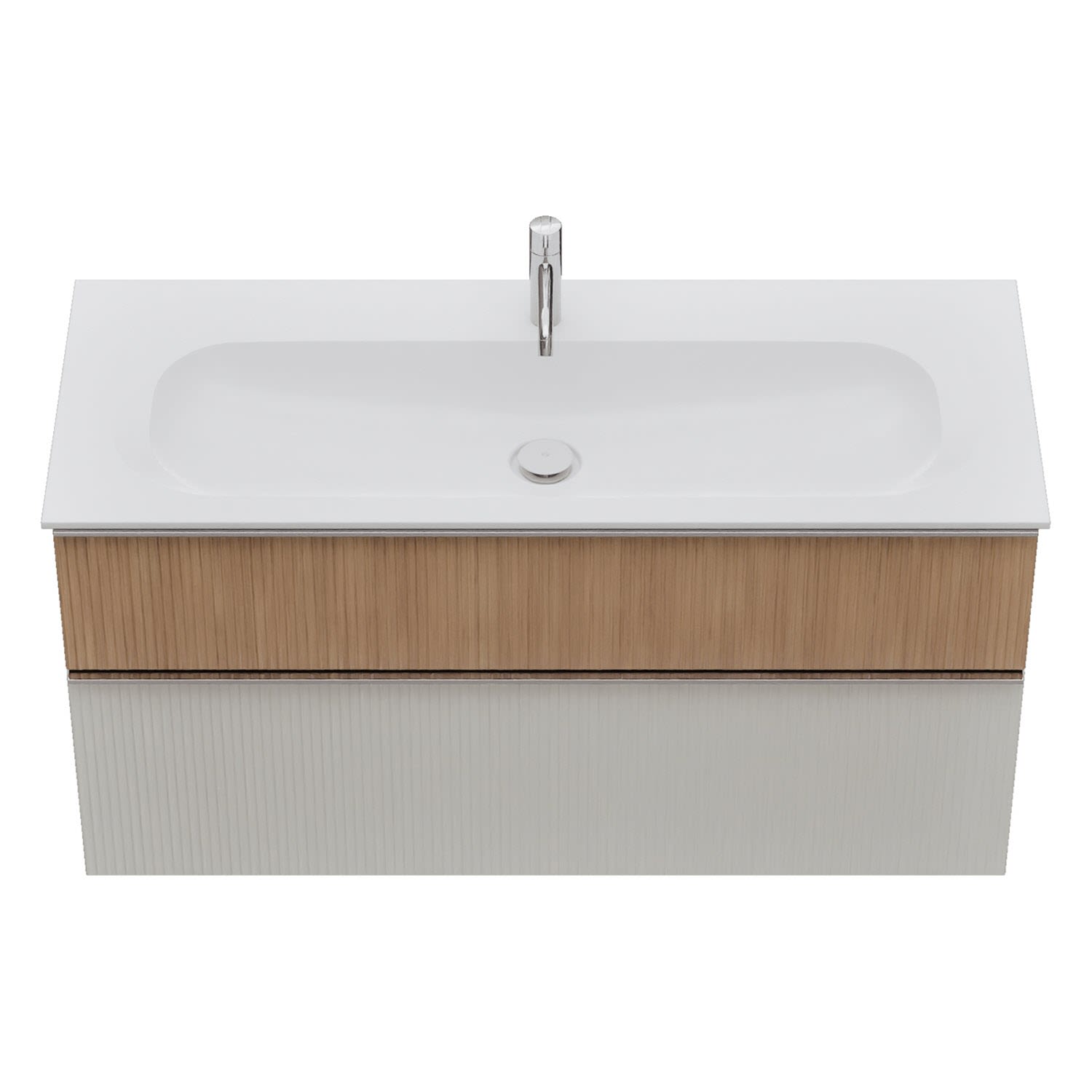 - 1 Schublade oben, 35 cm tief, mit vertikaler Struktur inkl. Siphonausschnitt und Inneneinteilung