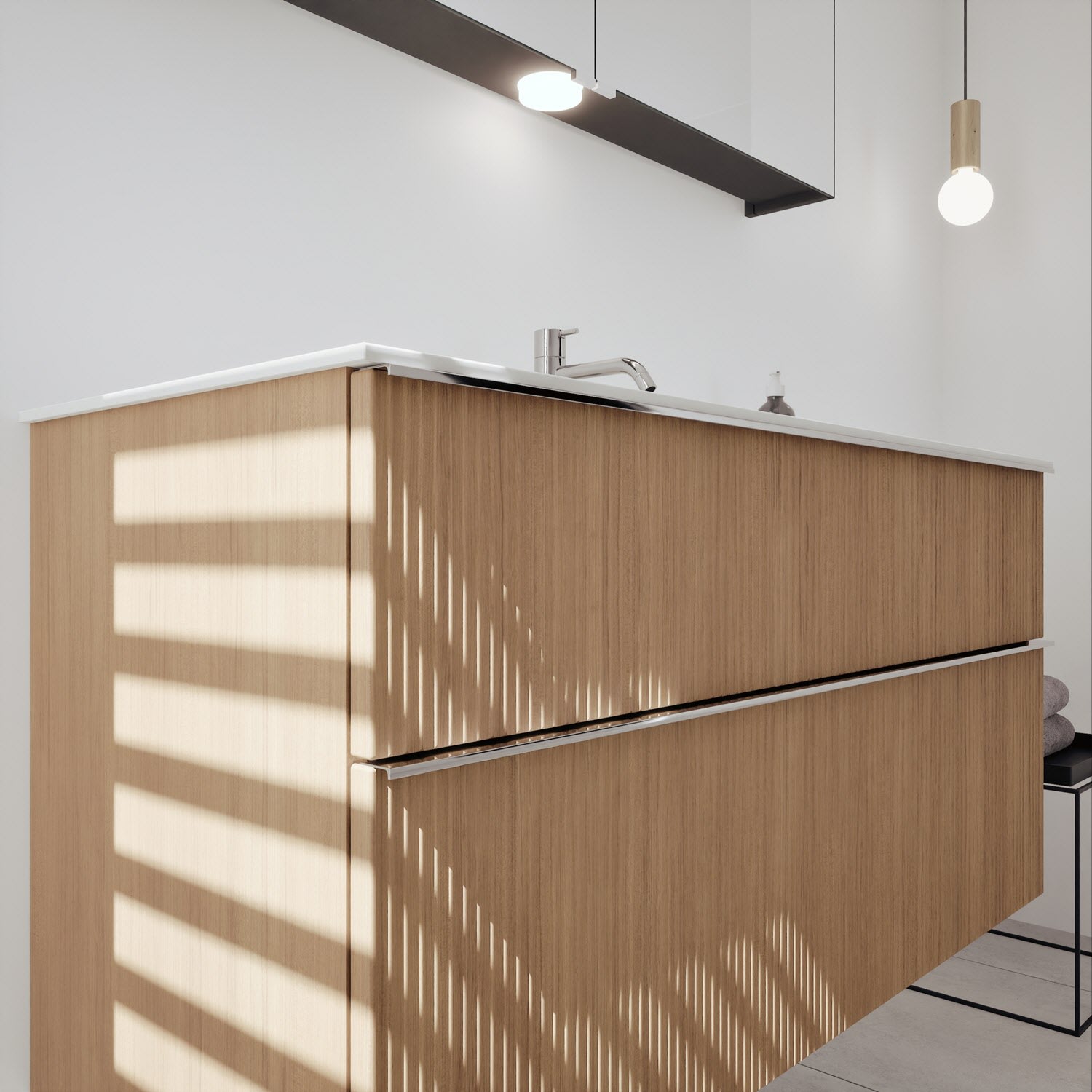 - 1 Schublade oben, 35 cm tief, mit vertikaler Struktur inkl. Siphonausschnitt und Inneneinteilung