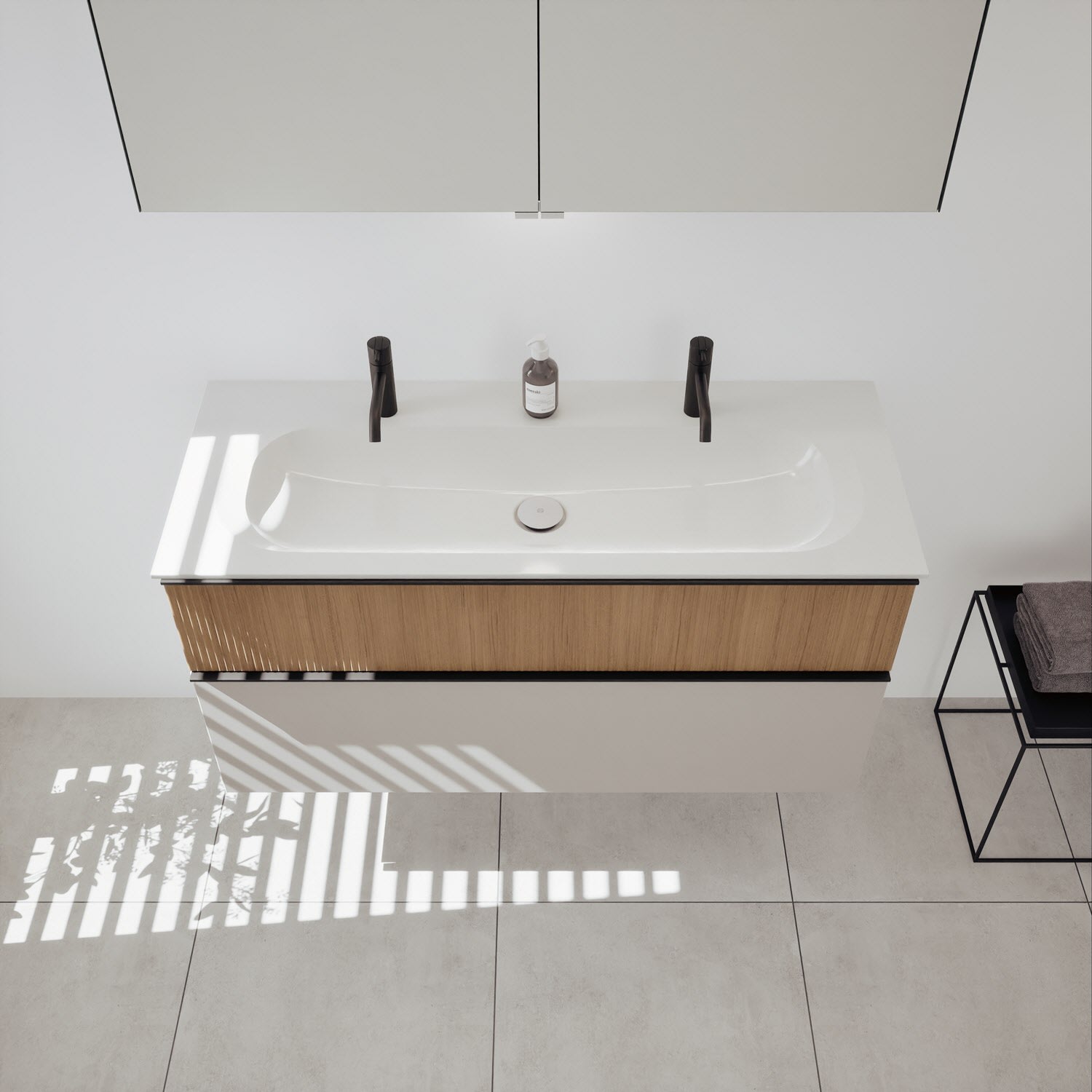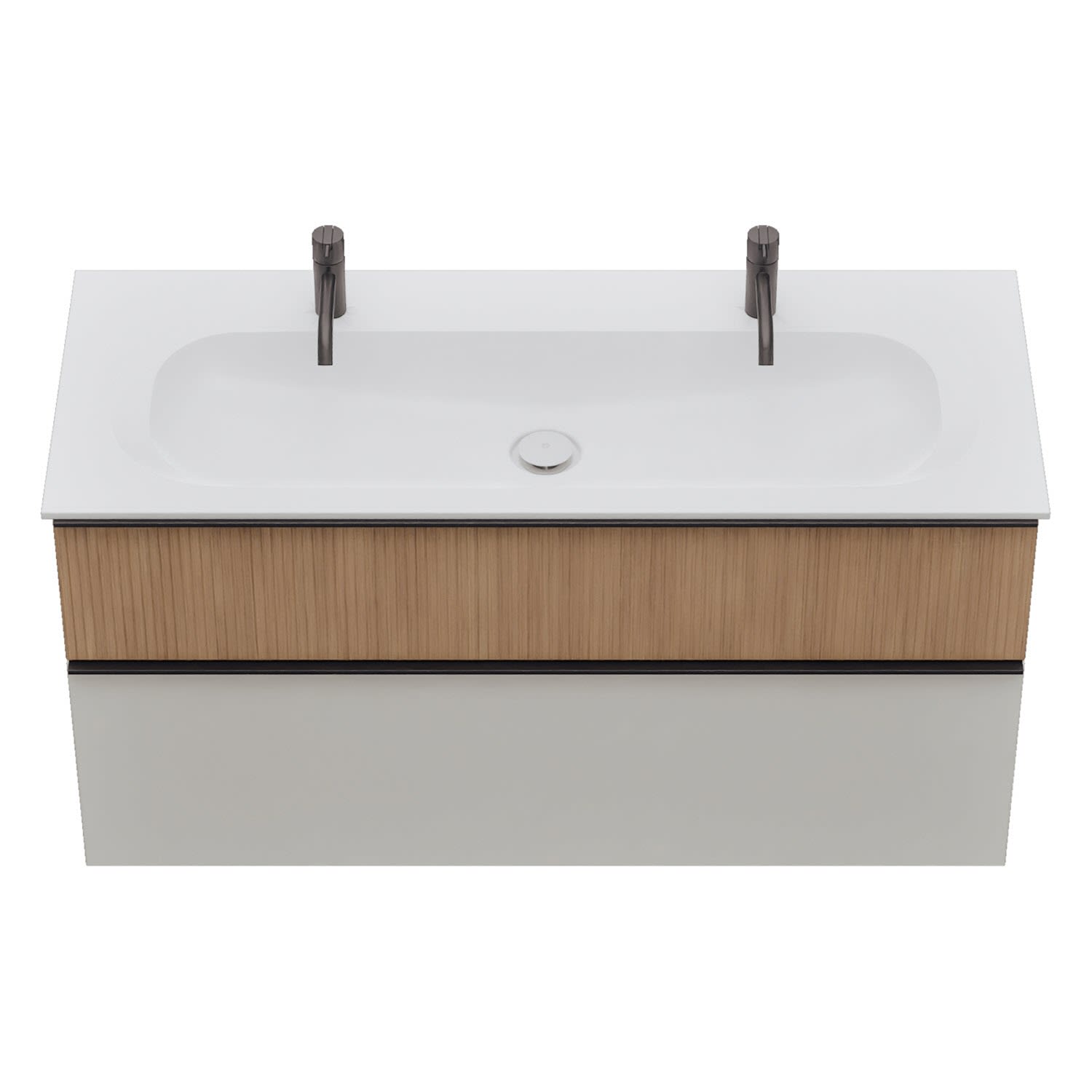- 1 Schublade oben: 35 cm tief, mit vertikaler Struktur inkl. Siphonausschnitt und Inneneinteilung