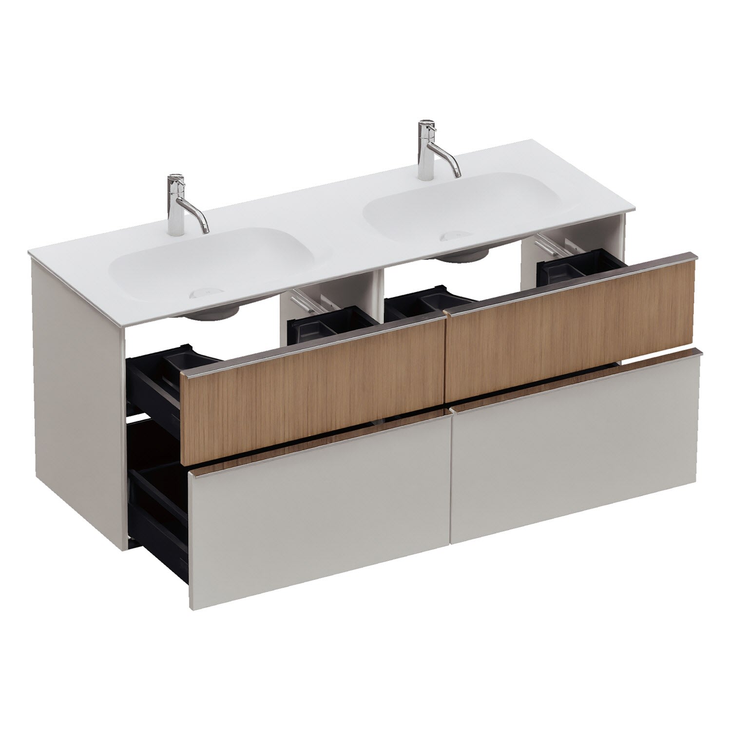 - 2 Schubladen oben, 35 cm tief, mit Siphonausschnitt und Inneneinteilung